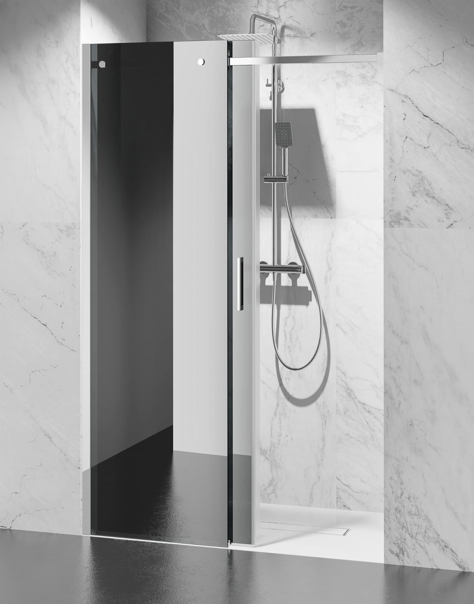 DRZWI PRYSZNICOWE PRZESUWNE, CHROMOWANE OKUCIA, SZKŁO GRAFITOWE DYMIONE