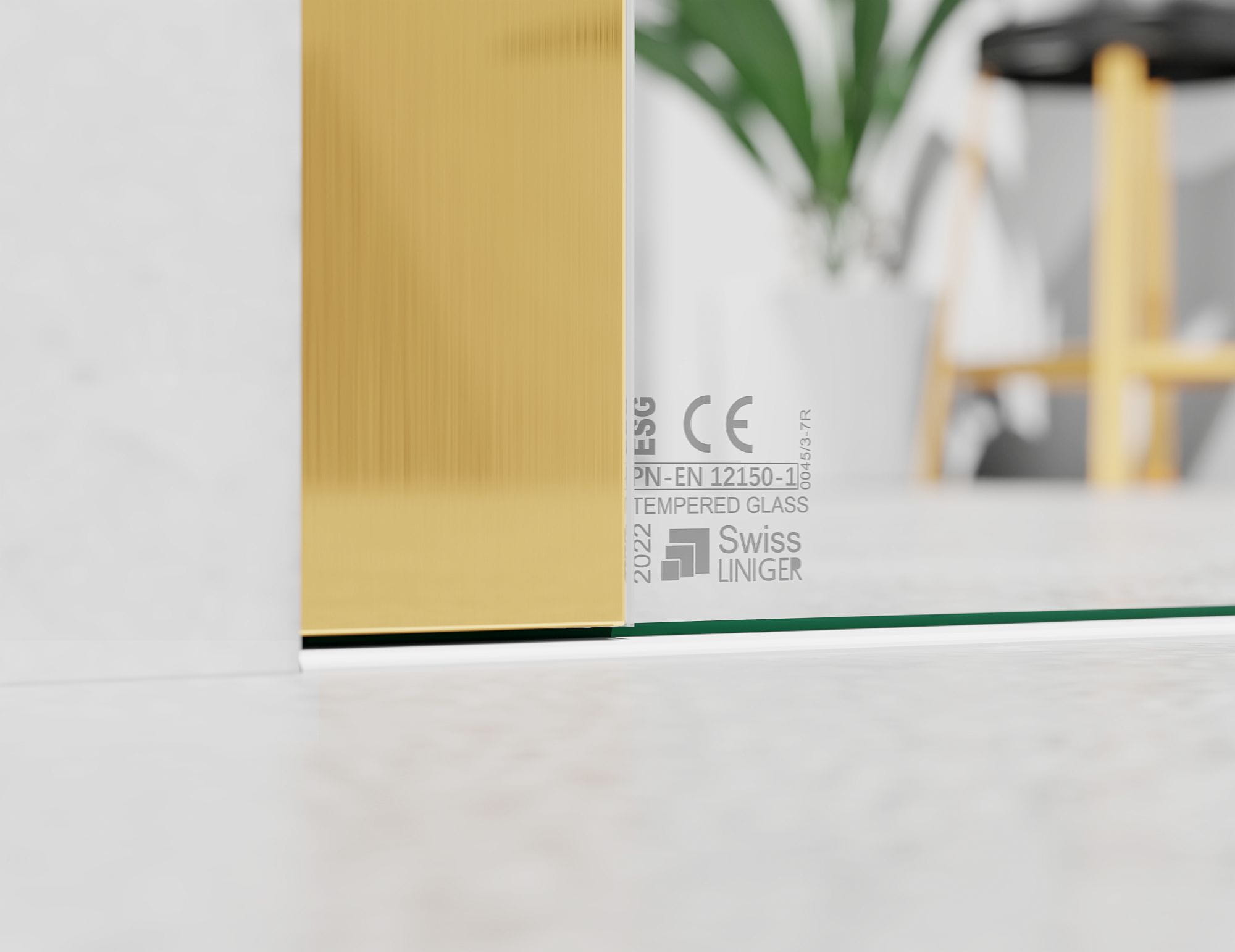 DRZWI PRYSZNICOWE PRZESUWNE, OKUCIA ZŁOTO SZCZOTKOWANE, SZKŁO LUSTRZANE