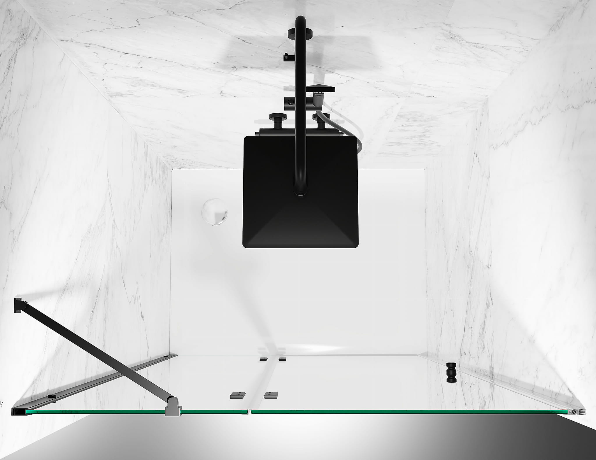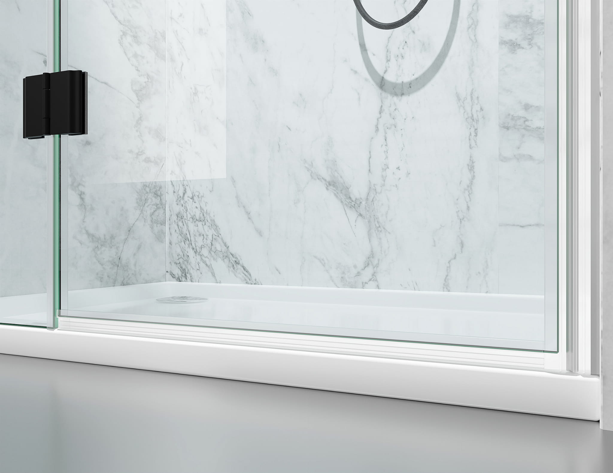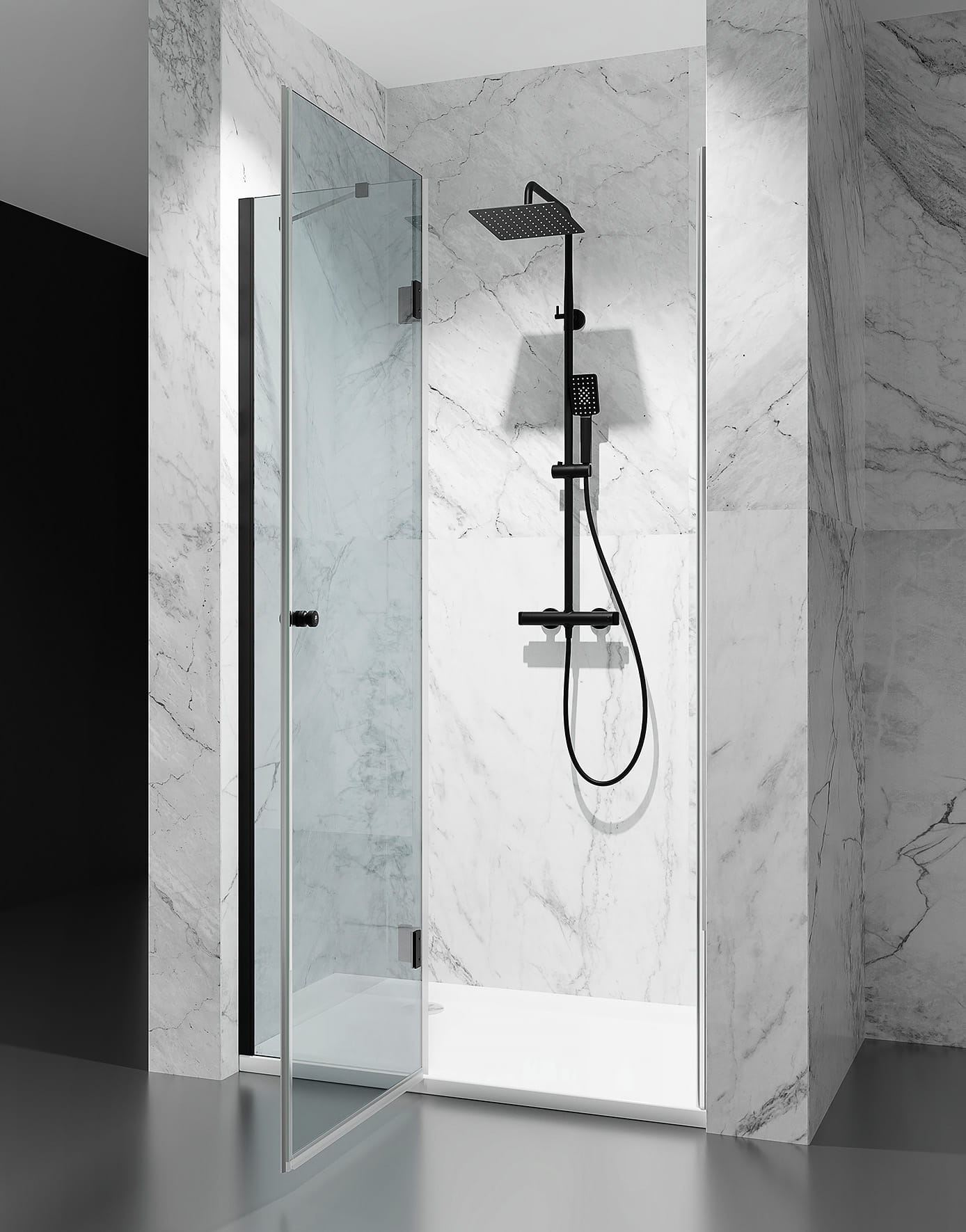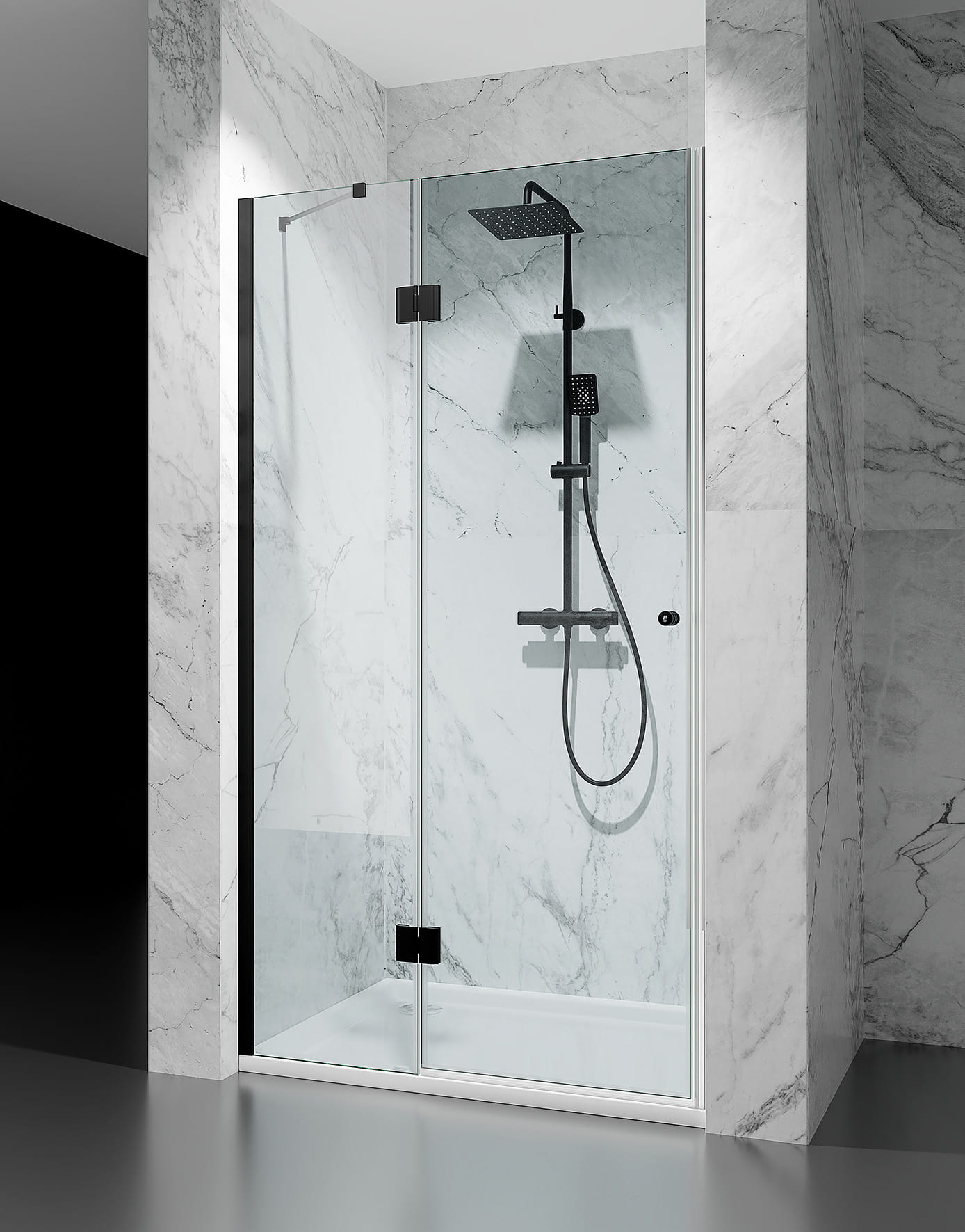 DRZWI PRYSZNICOWE UCHYLNE ZE ŚCIANKĄ, SZKŁO TRANSPARENTNE, OKUCIA CZARNY MAT