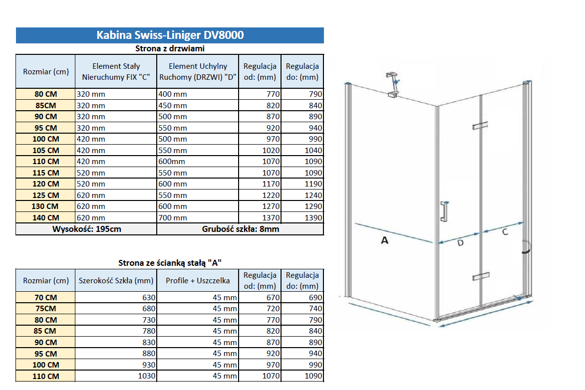 Dane techniczne kabiny prysznicowej uchylnej