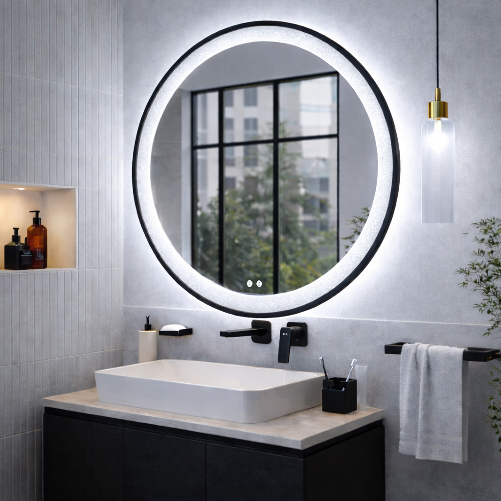 Lustro podświetlane LED z czarną ramą oraz piaskowaniem średnica 60-120cm