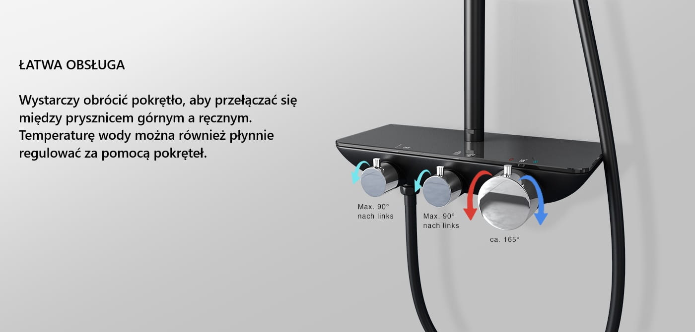 ✔ Termostat – zapewnia stałą temperaturę wody, zwiększając komfort i bezpieczeństwo kąpieli