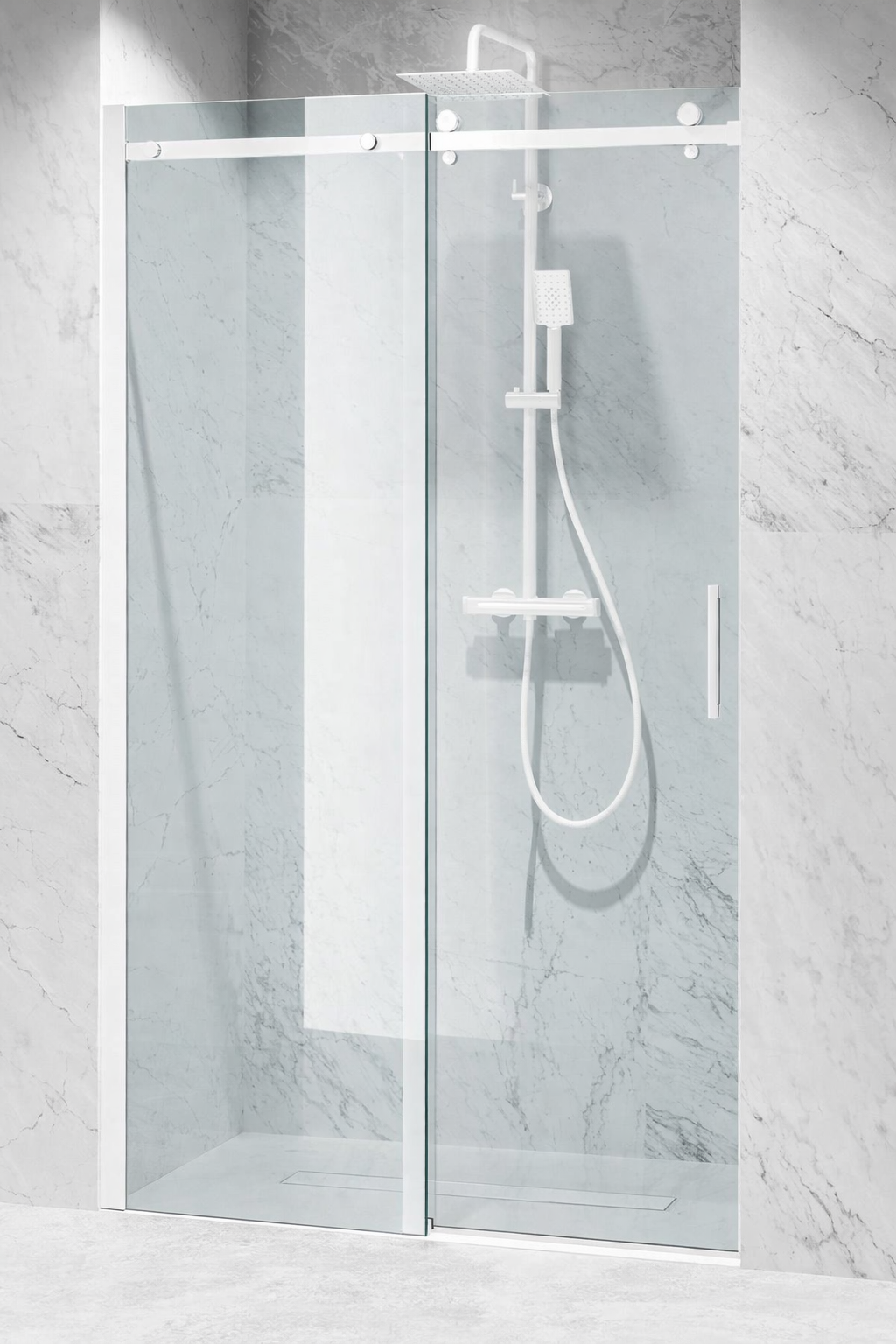 DRZWI PRYSZNICOWE PRZESUWNE, BIAŁE OKUCIA, SZKŁO TRANSPARENTNE