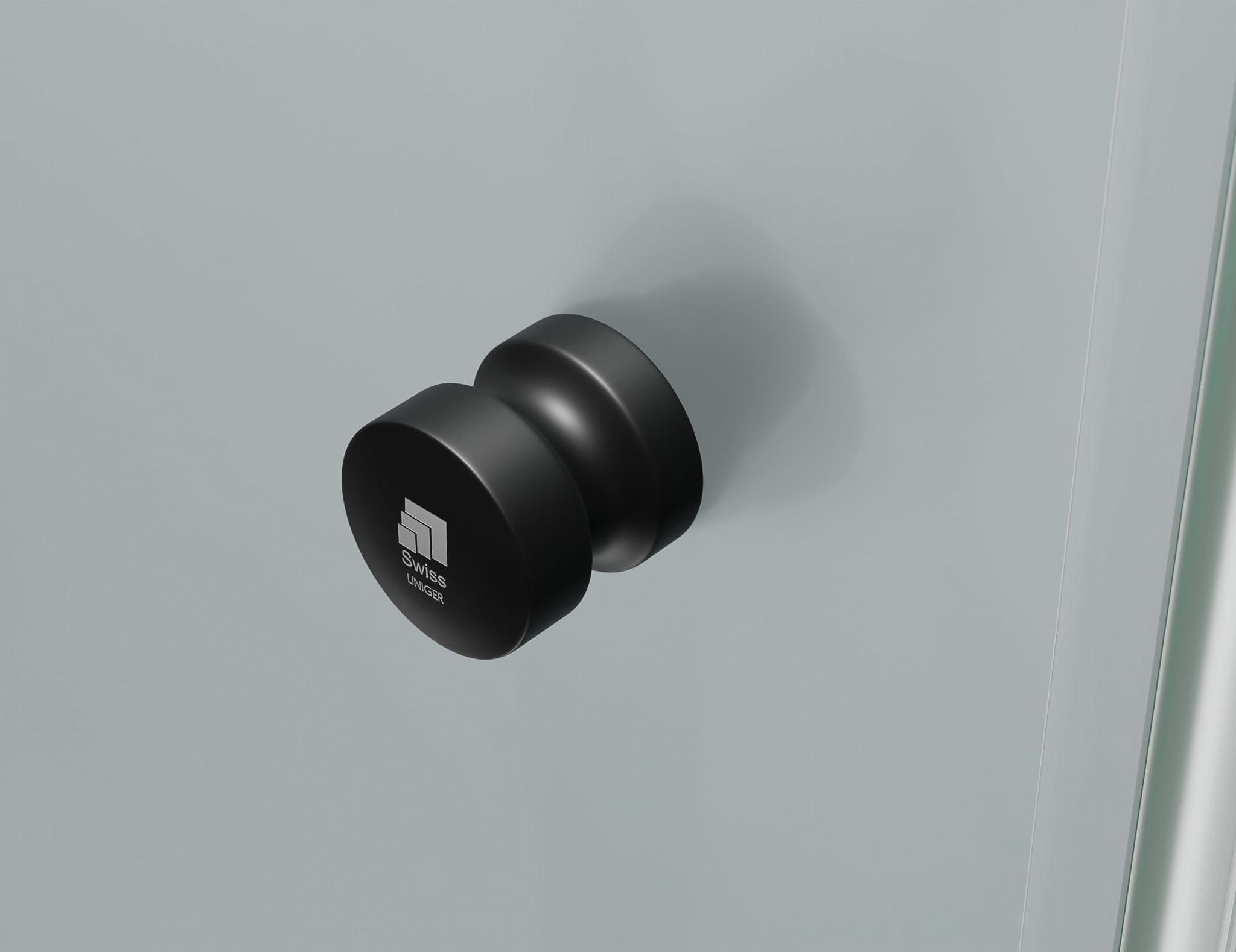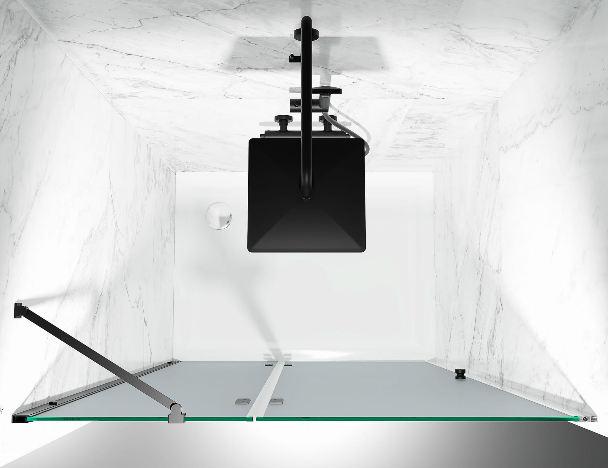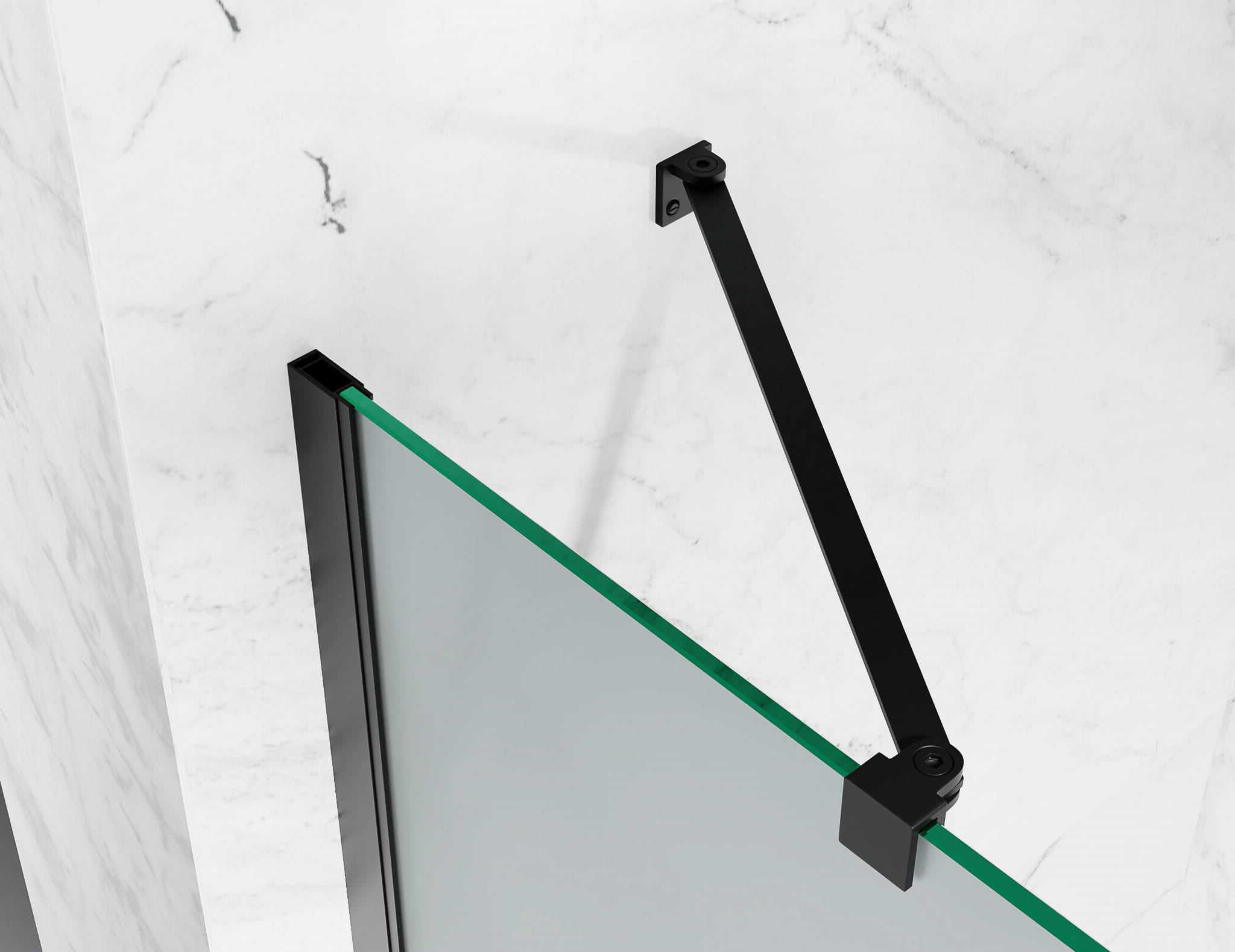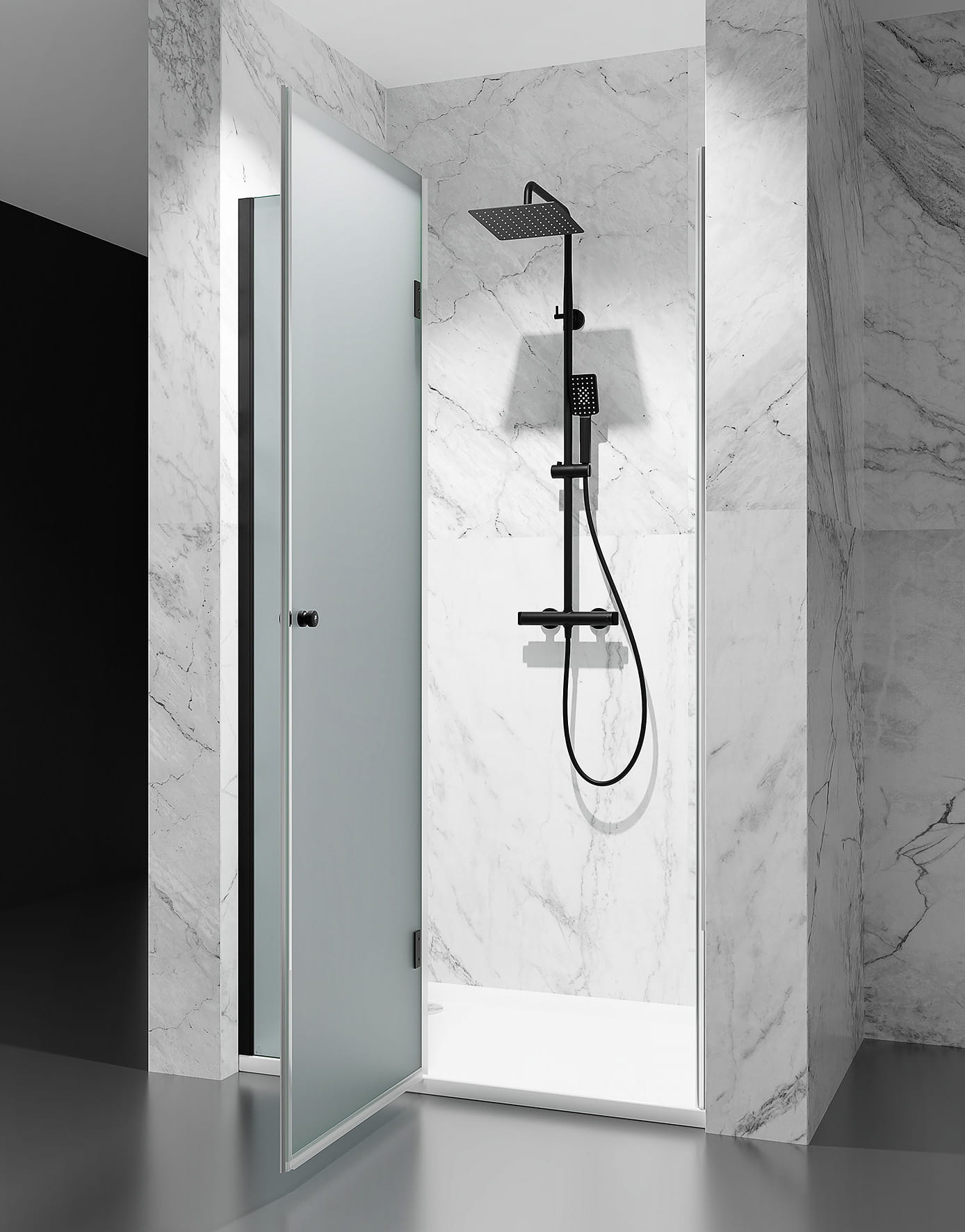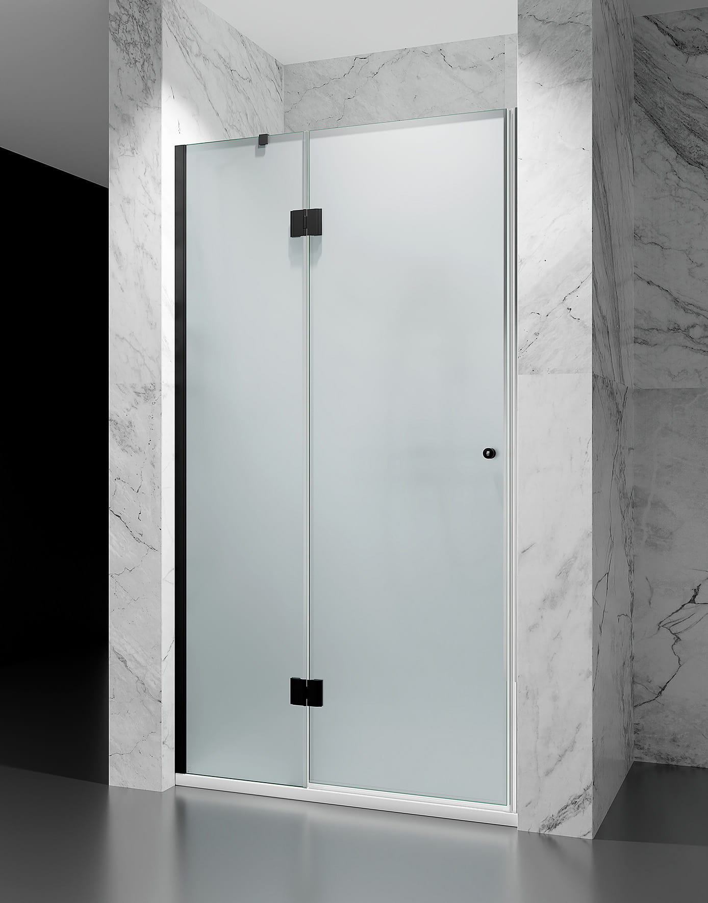 DRZWI PRYSZNICOWE UCHYLNE ZE ŚCIANKĄ, SZKŁO MROŻONE MLECZNE, OKUCIA CZARNY MAT