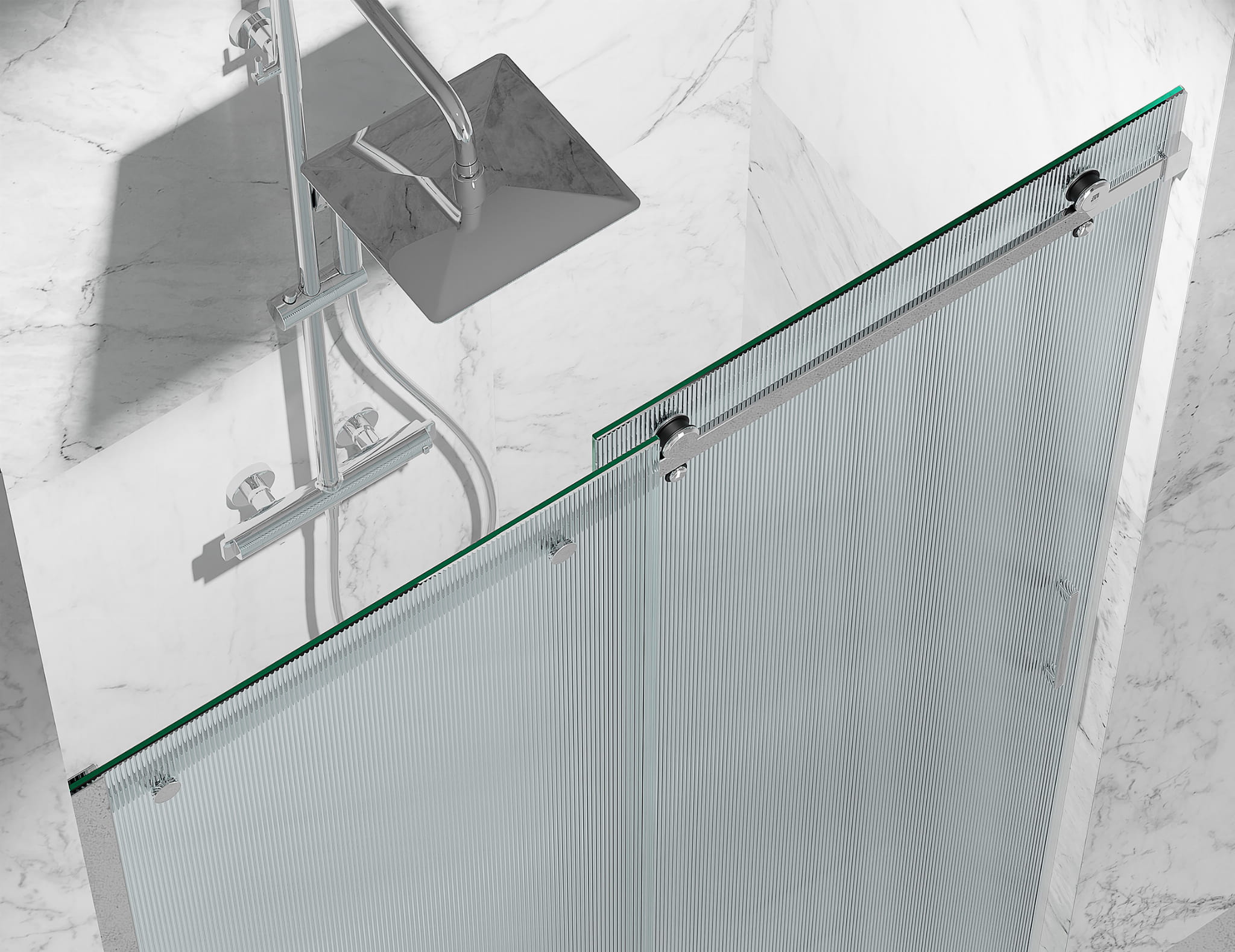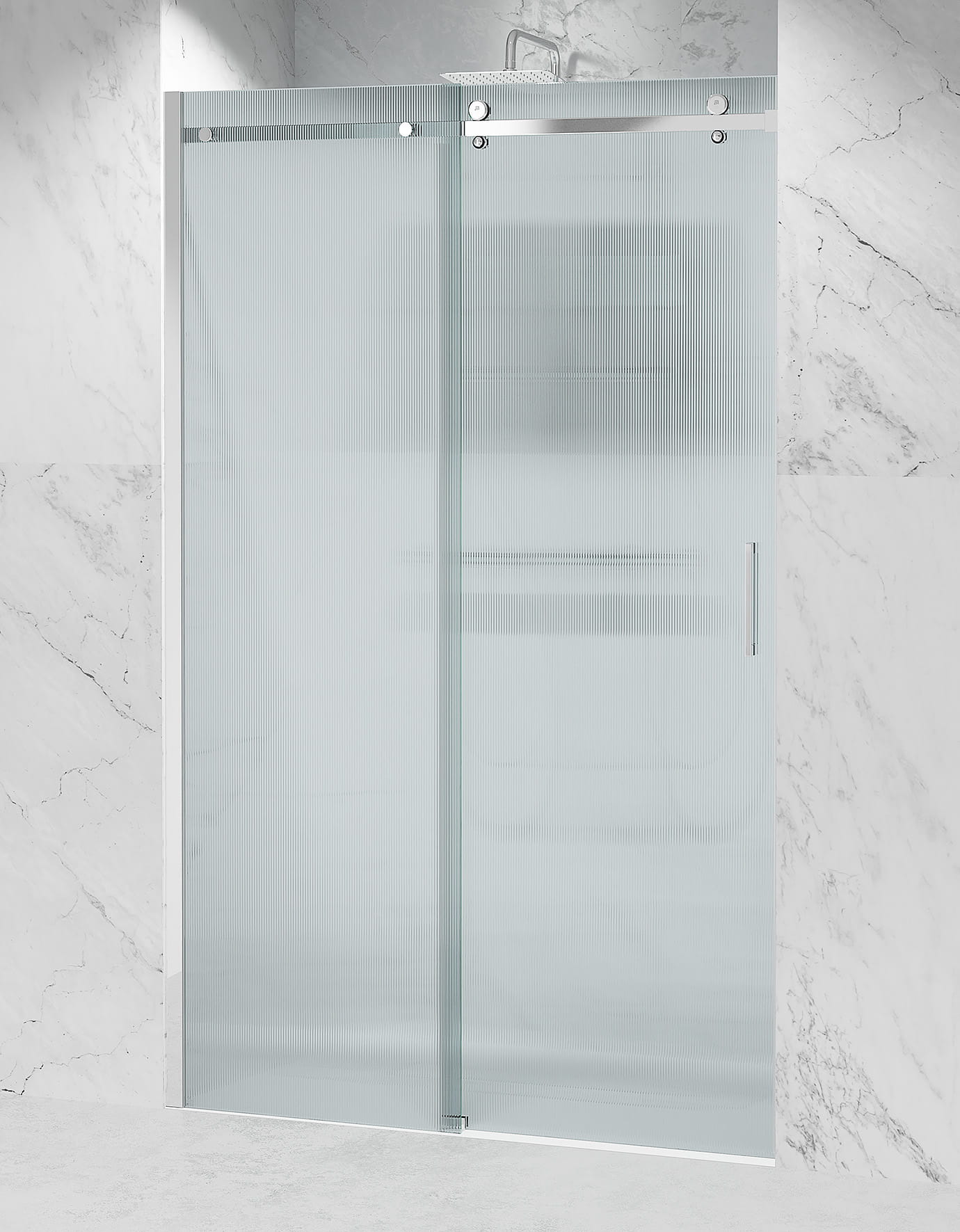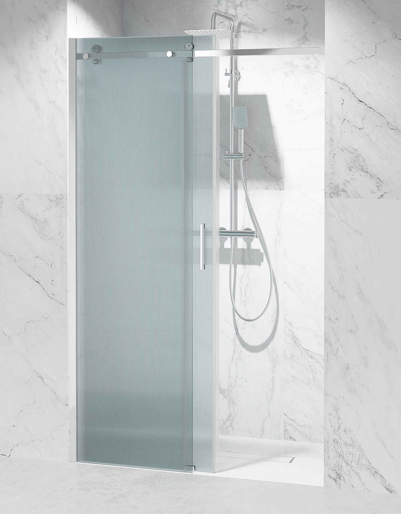 Delikatne pionowe żłobienia rozpraszają światło, dzięki czemu kabina pozostaje jasna, a jednocześnie ukrywa sylwetkę za subtelną „mgiełką”. Struktura szkła sprawia, że ślady wody i drobne zarysowania są mniej widoczne, a powierzchnia dłużej wygląda jak nowa.