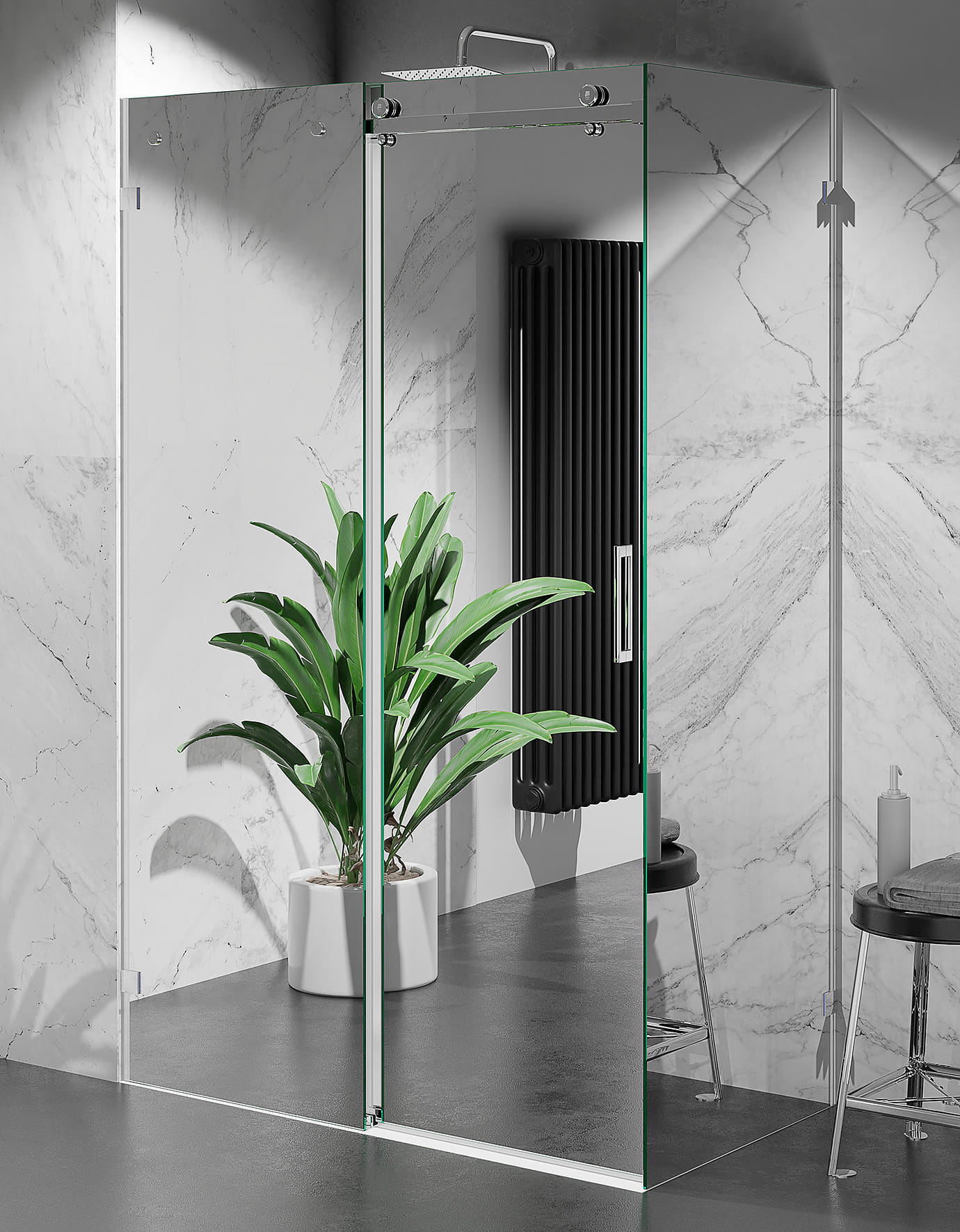 KABINA PRYSZNICOWA PRZESUWNA BEZPROFILOWA, SZKŁO EFEKT LUSTRA, OKUCIA CHROM POŁYSK