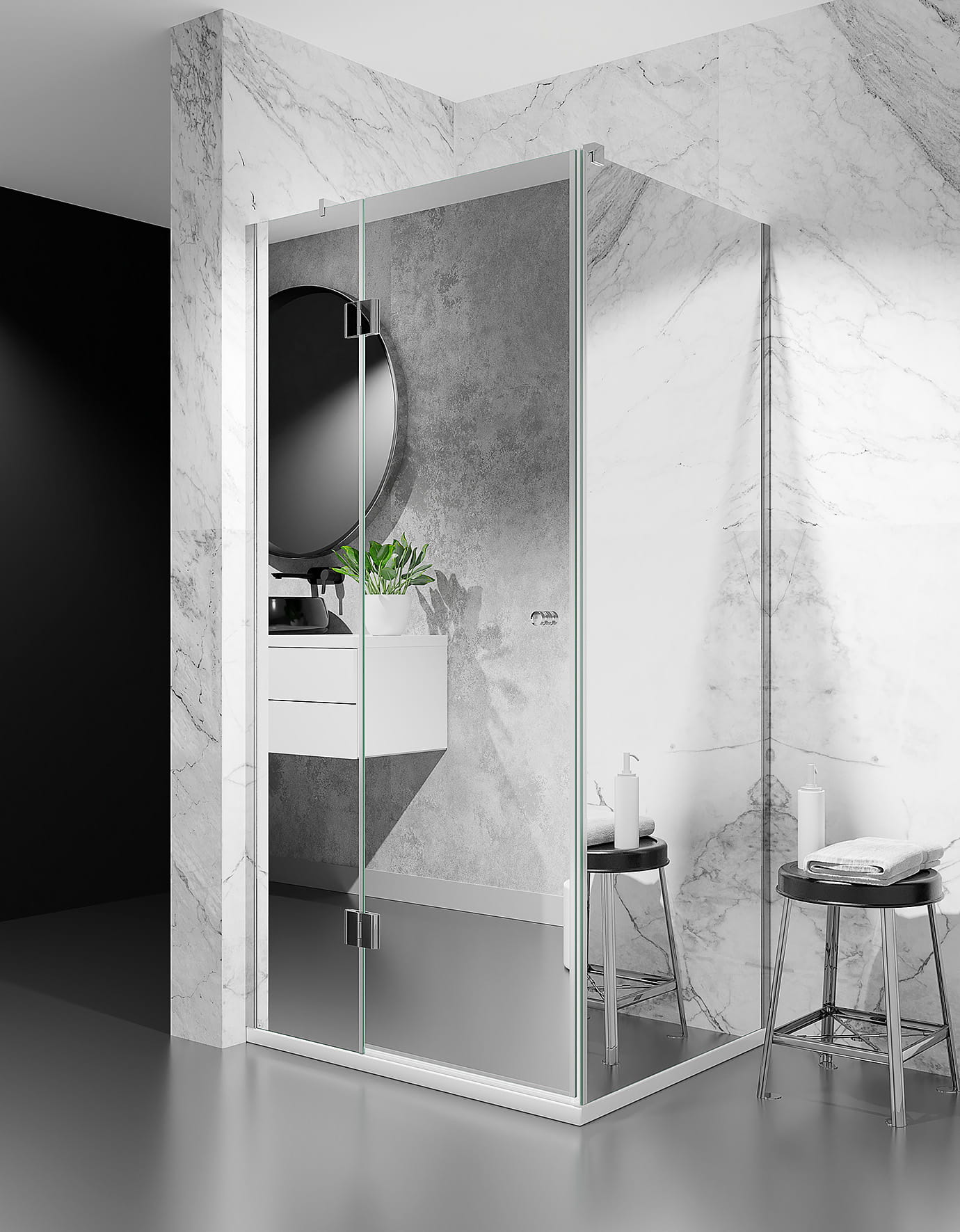 KABINA PRYSZNICOWA UCHYLNA DV8100, OKUCIA CHROM POŁYSK, SZKŁO EFEKT LUSTRA