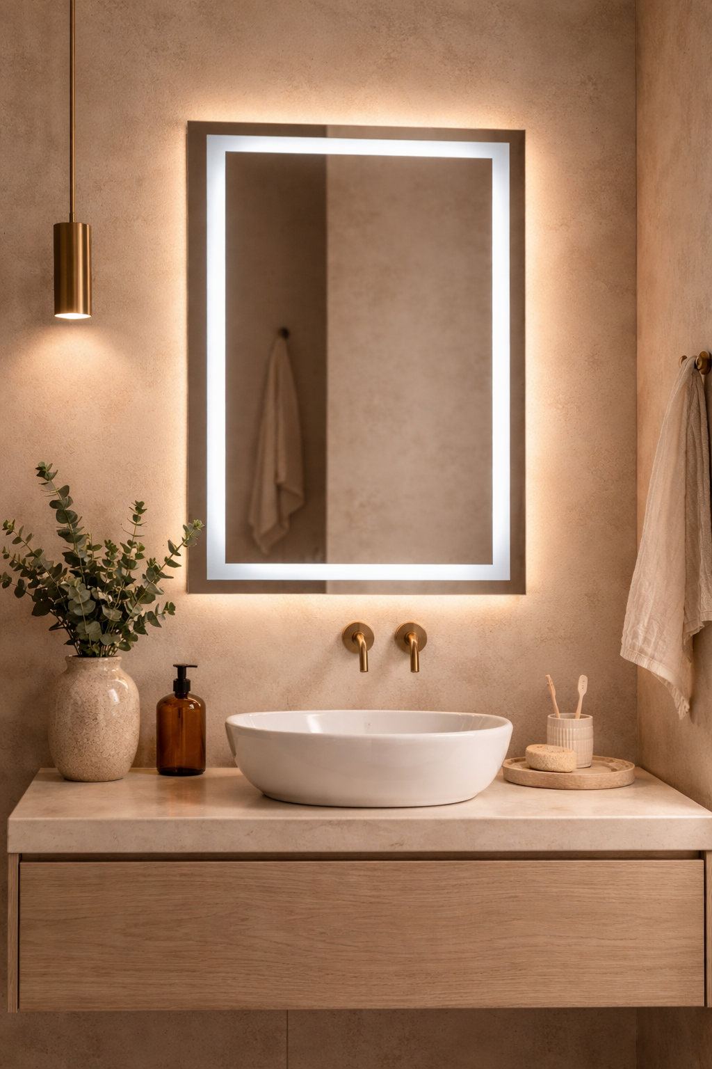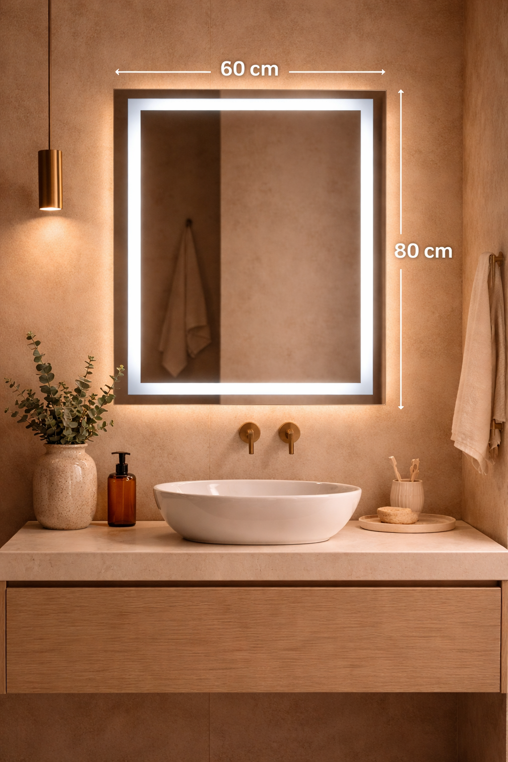 Doskonałe prostokątne lustro 80x60cm z delikatną piaskowaną ramą i oświetleniem LED to niezwykły dodatek do Twojego wnętrza.