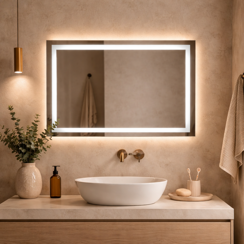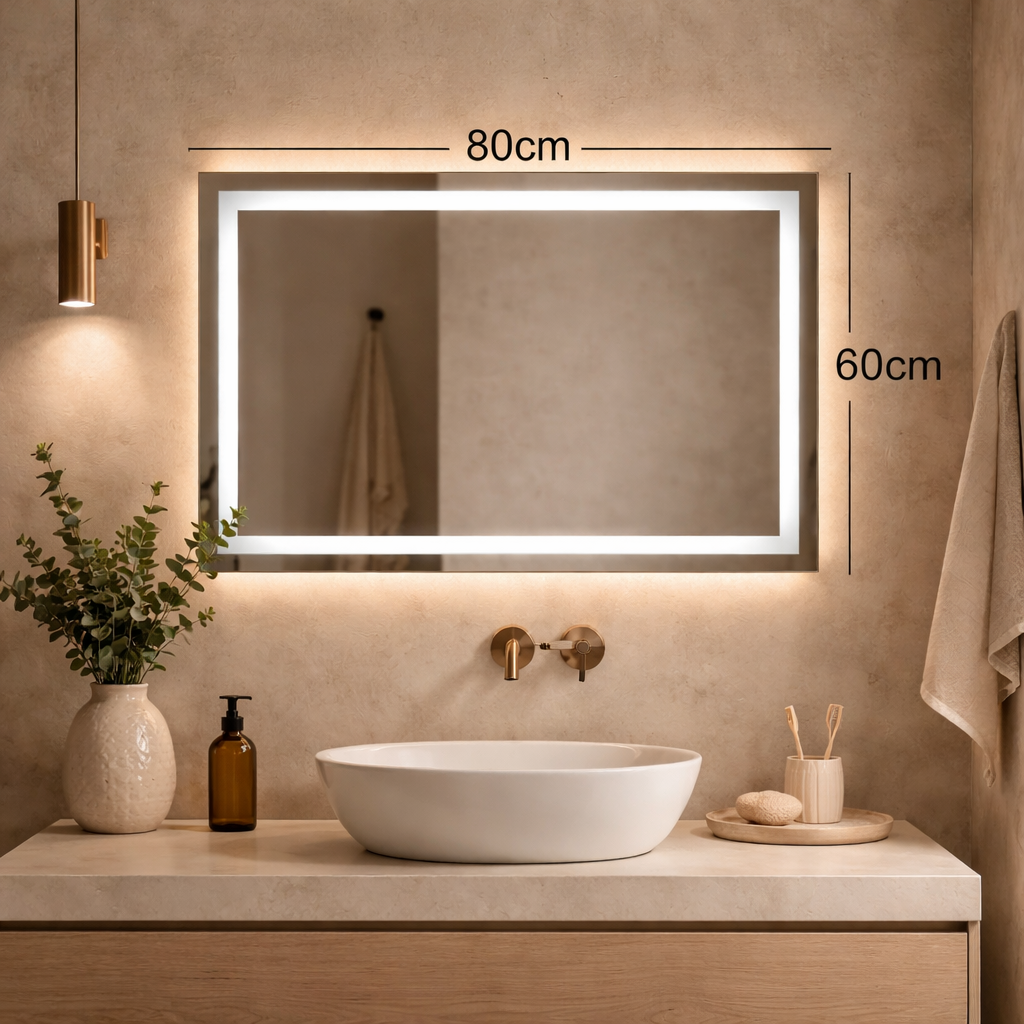 Doskonałe prostokątne lustro 80x60cm z delikatną piaskowaną ramą i oświetleniem LED to niezwykły dodatek do Twojego wnętrza.