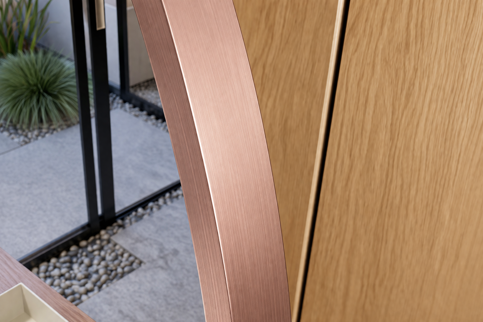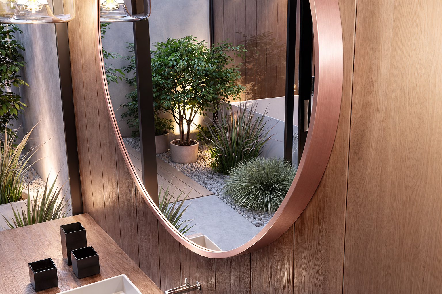 Okrągłe lustro w aluminiowej różowo-złotej ramie