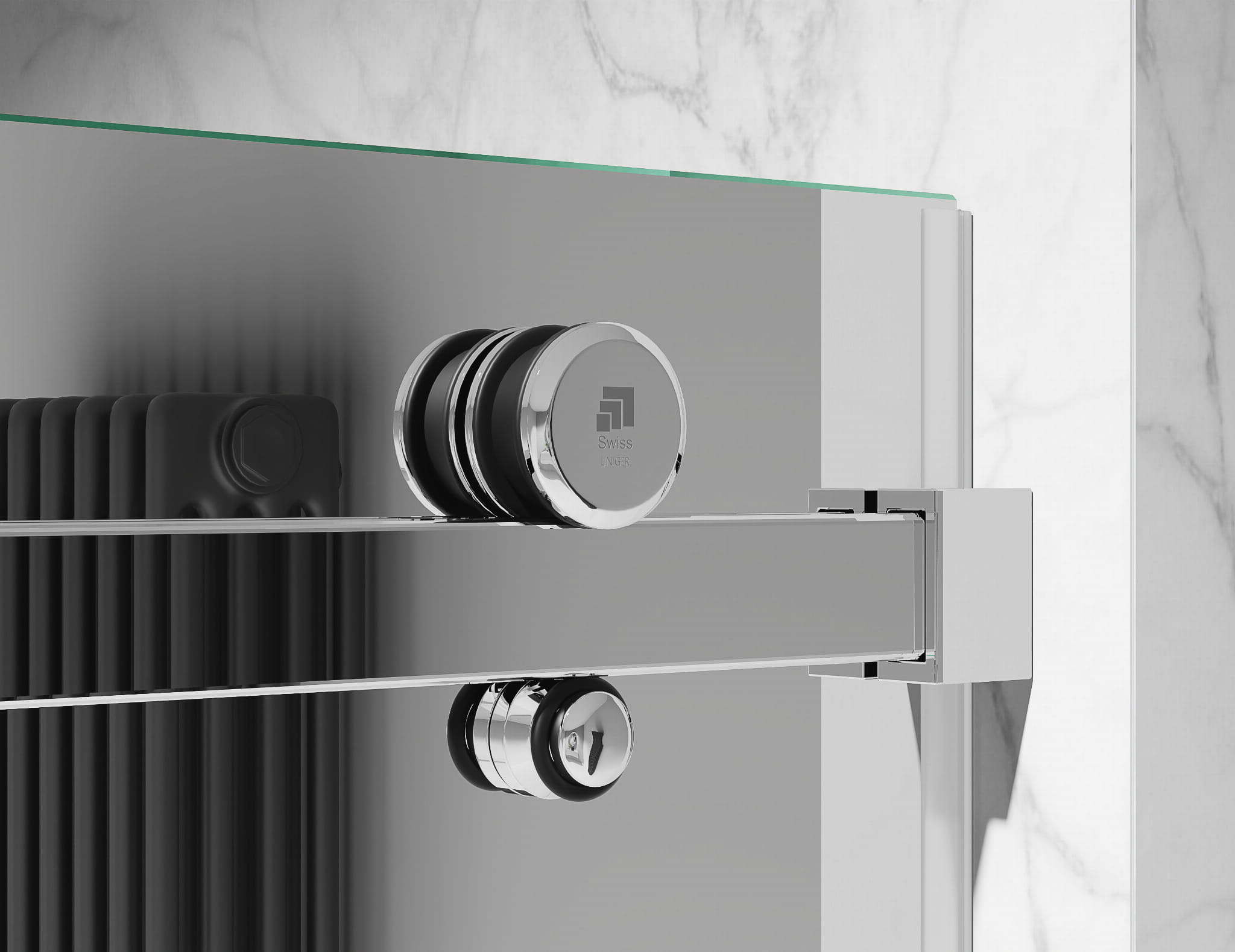DRZWI PRYSZNICOWE PRZESUWNE BEZPROFILOWE, CHROMOWANE OKUCIA, SZKŁO EFEKT LUSTRA
