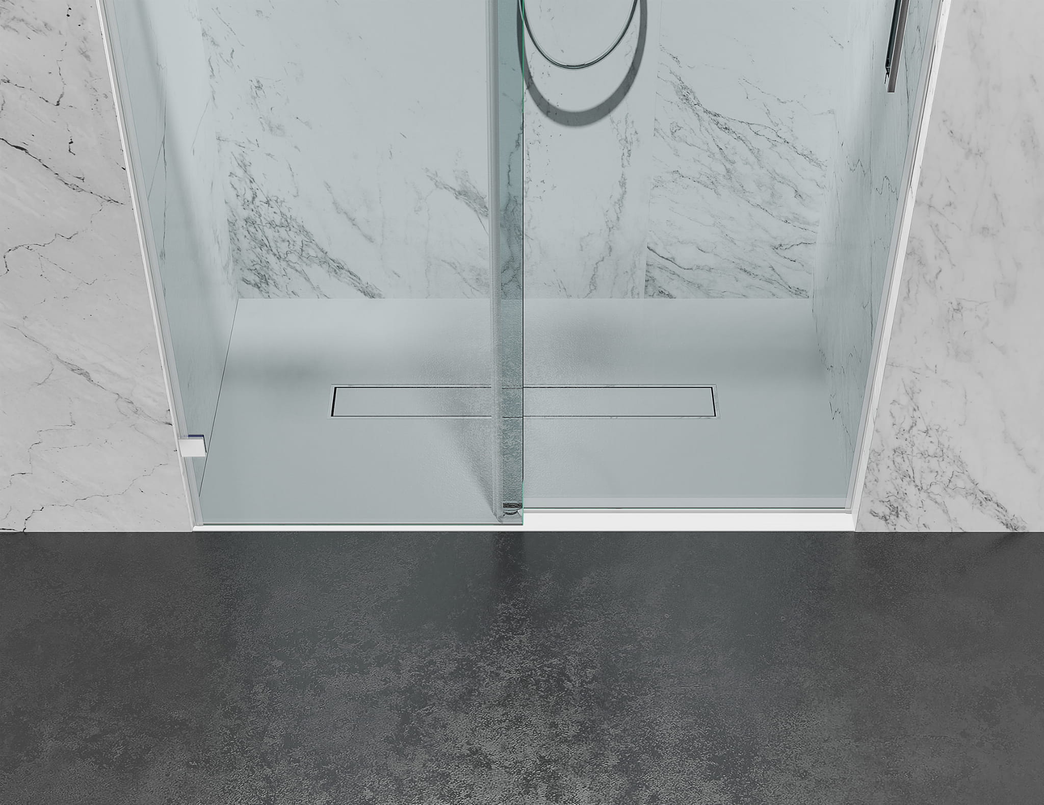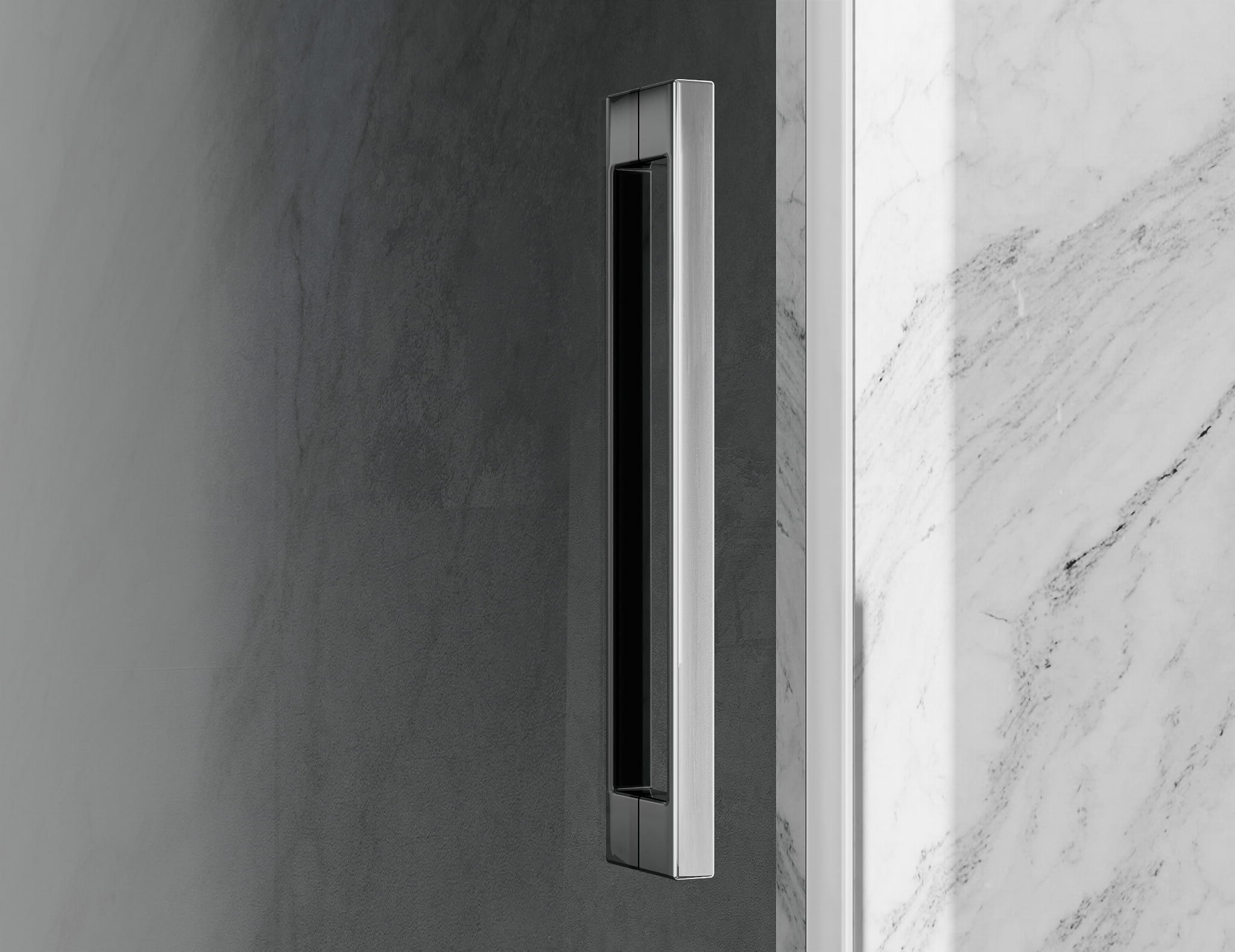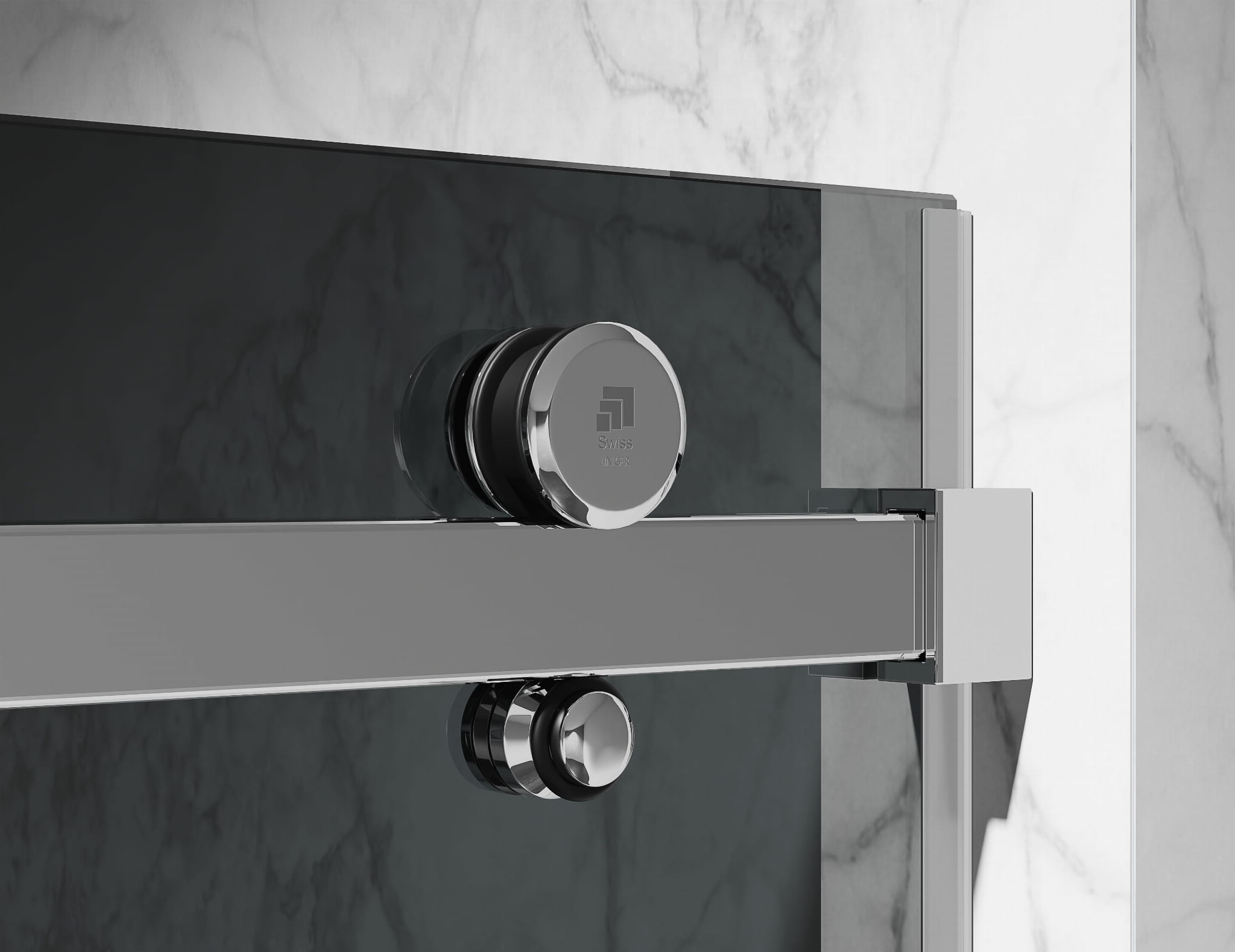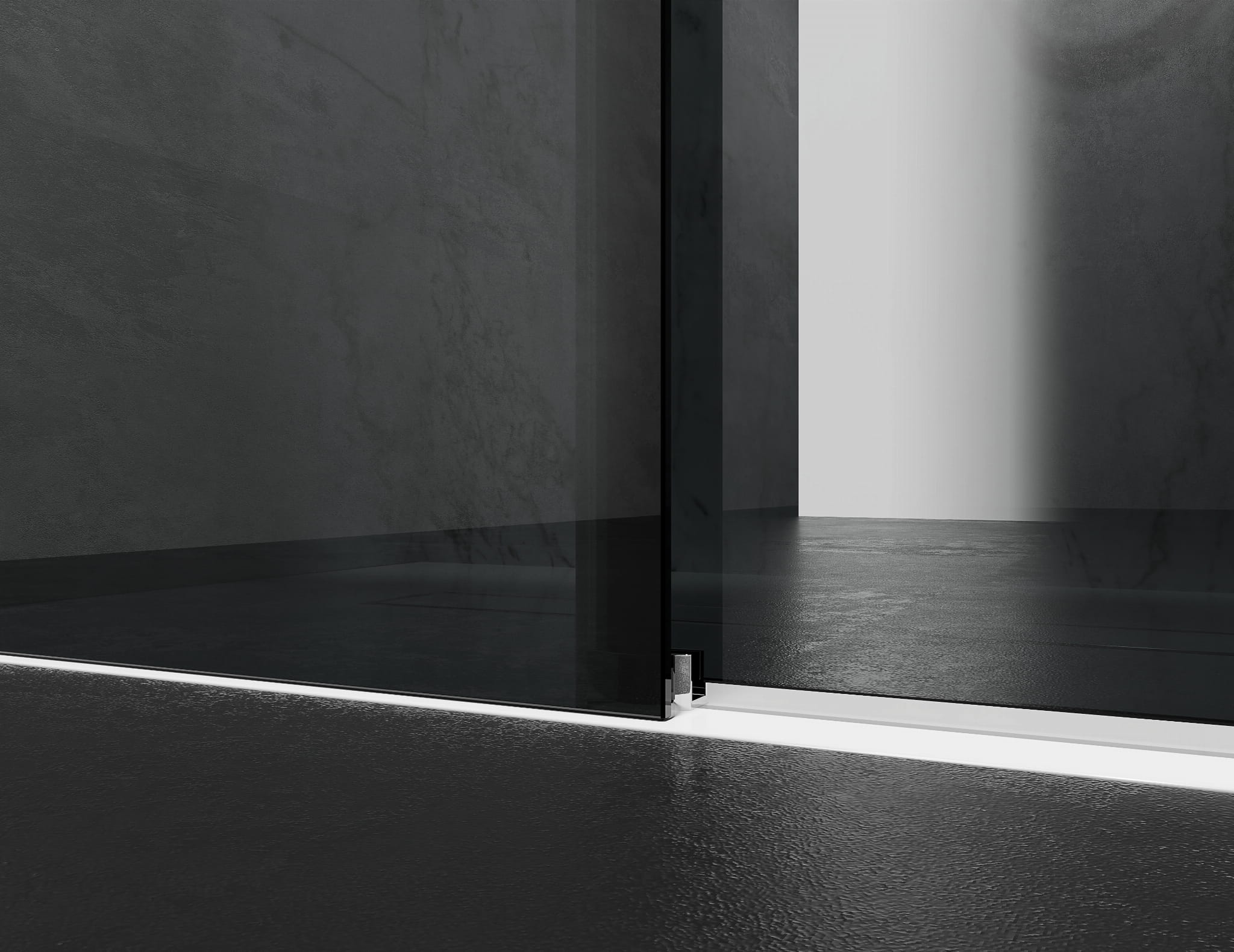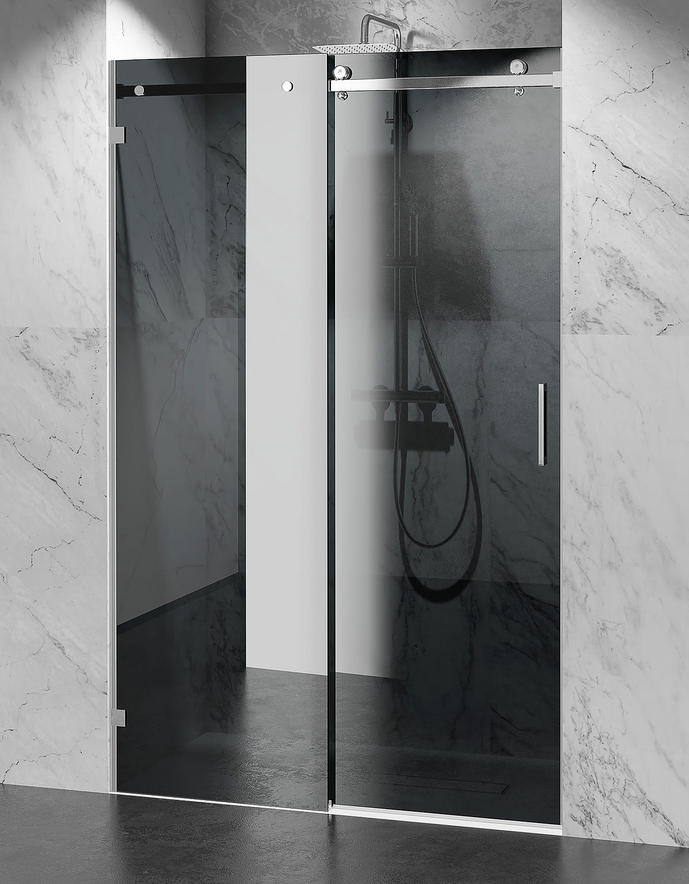 DRZWI PRYSZNICOWE PRZESUWNE BEZPROFILOWE, CHROMOWANE OKUCIA, SZKŁO GRAFITOWE