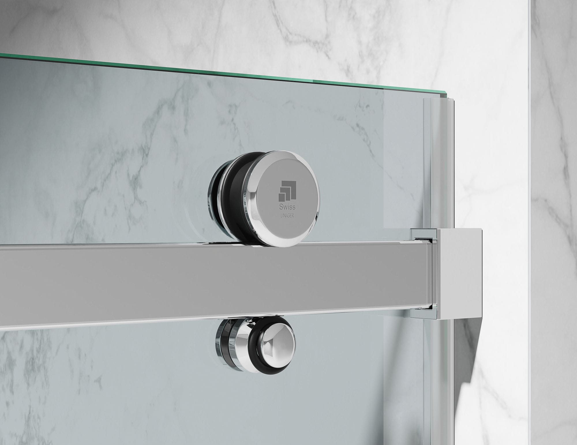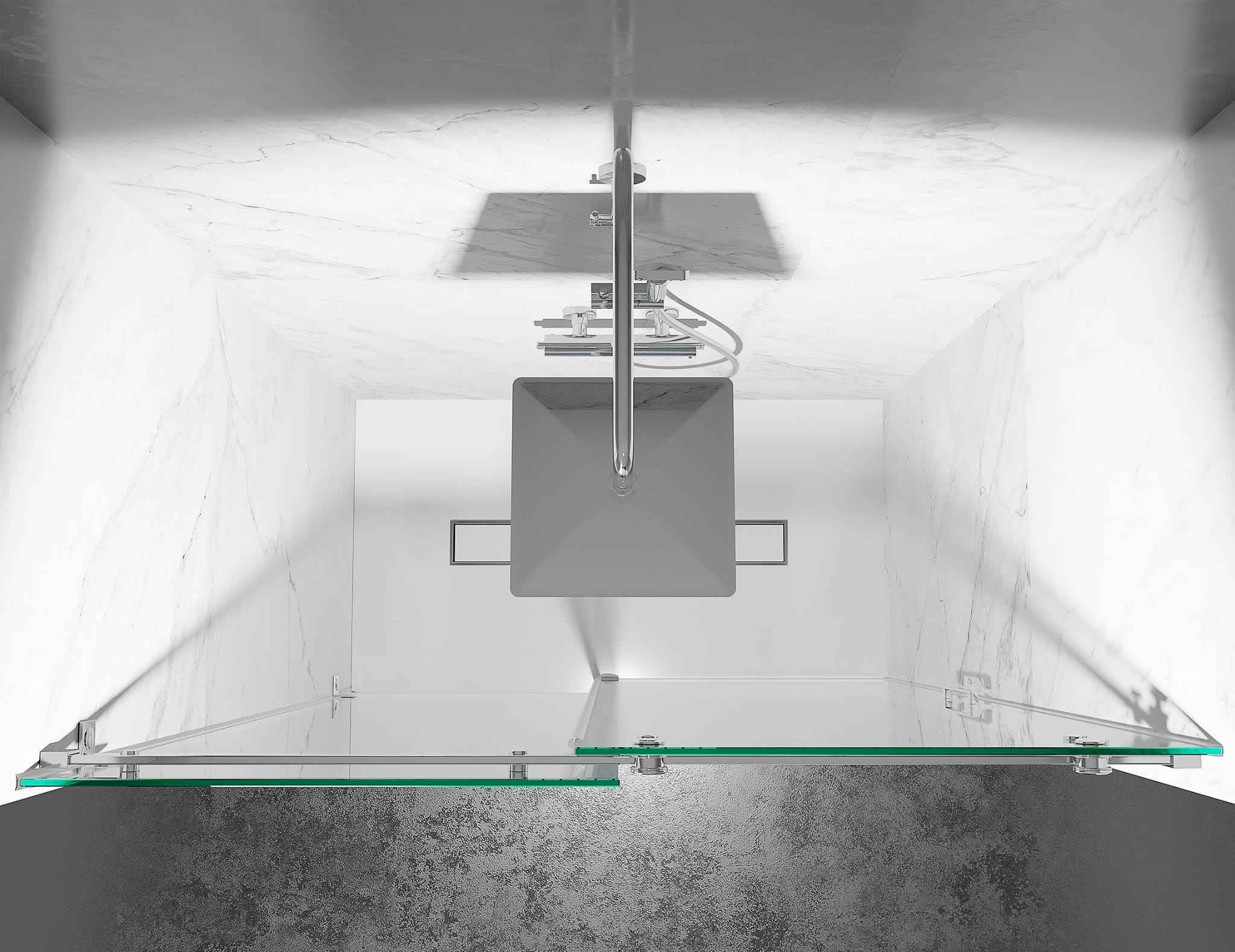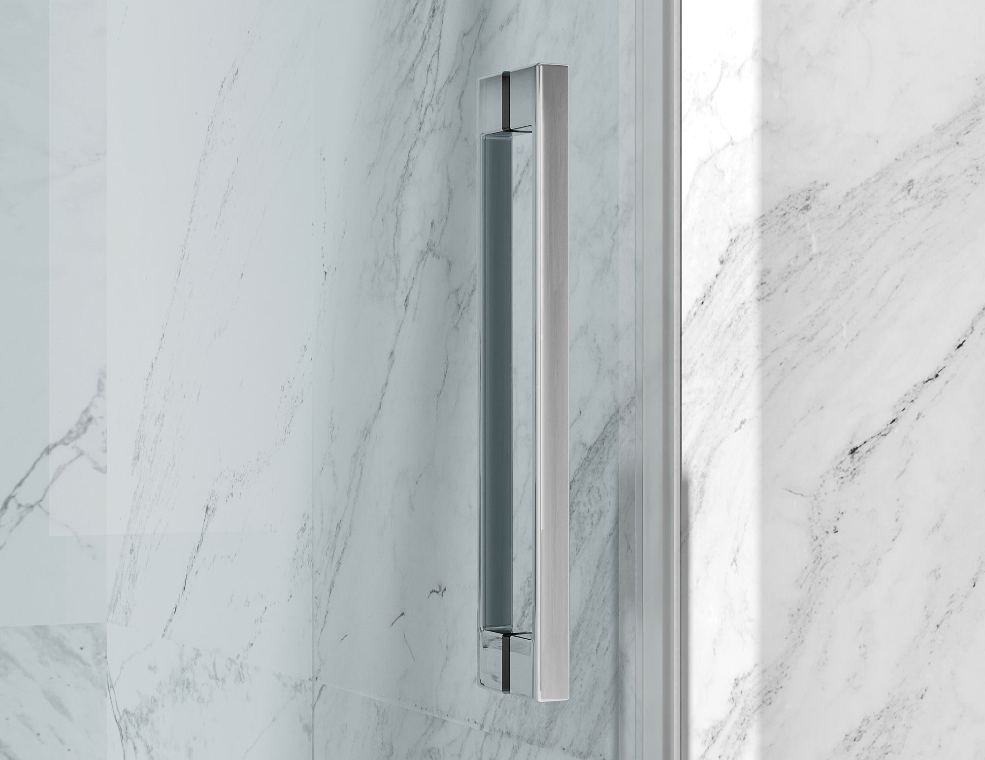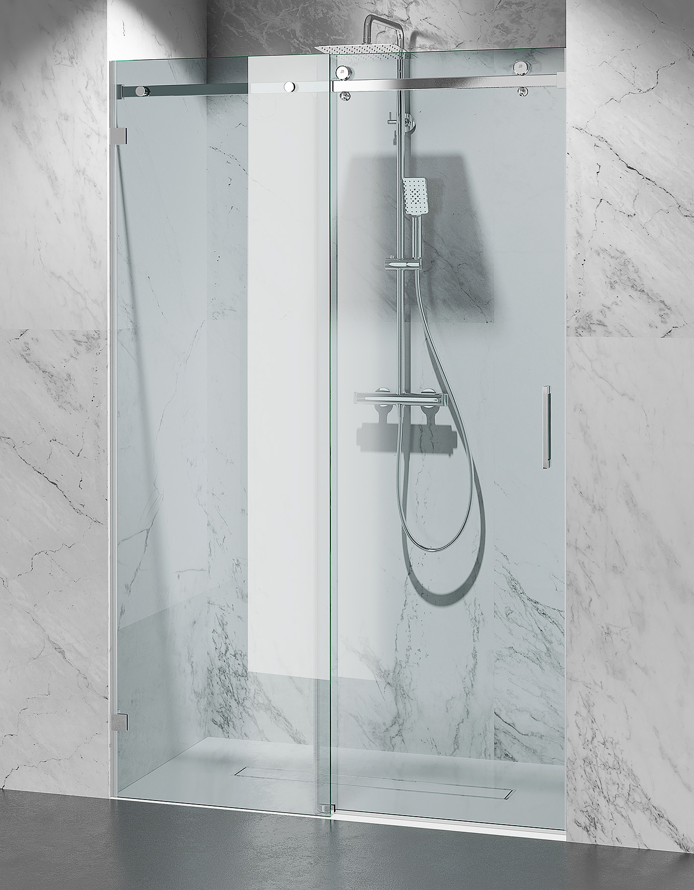 DRZWI PRYSZNICOWE PRZESUWNE BEZPROFILOWE, CHROMOWANE OKUCIA, SZKŁO TRANSPARENTNE