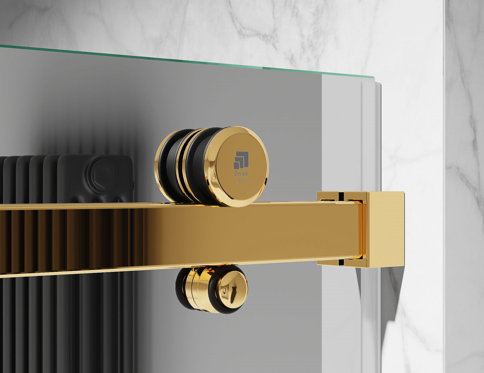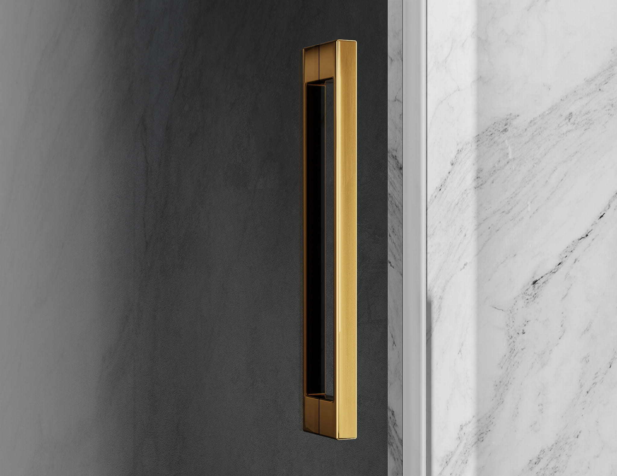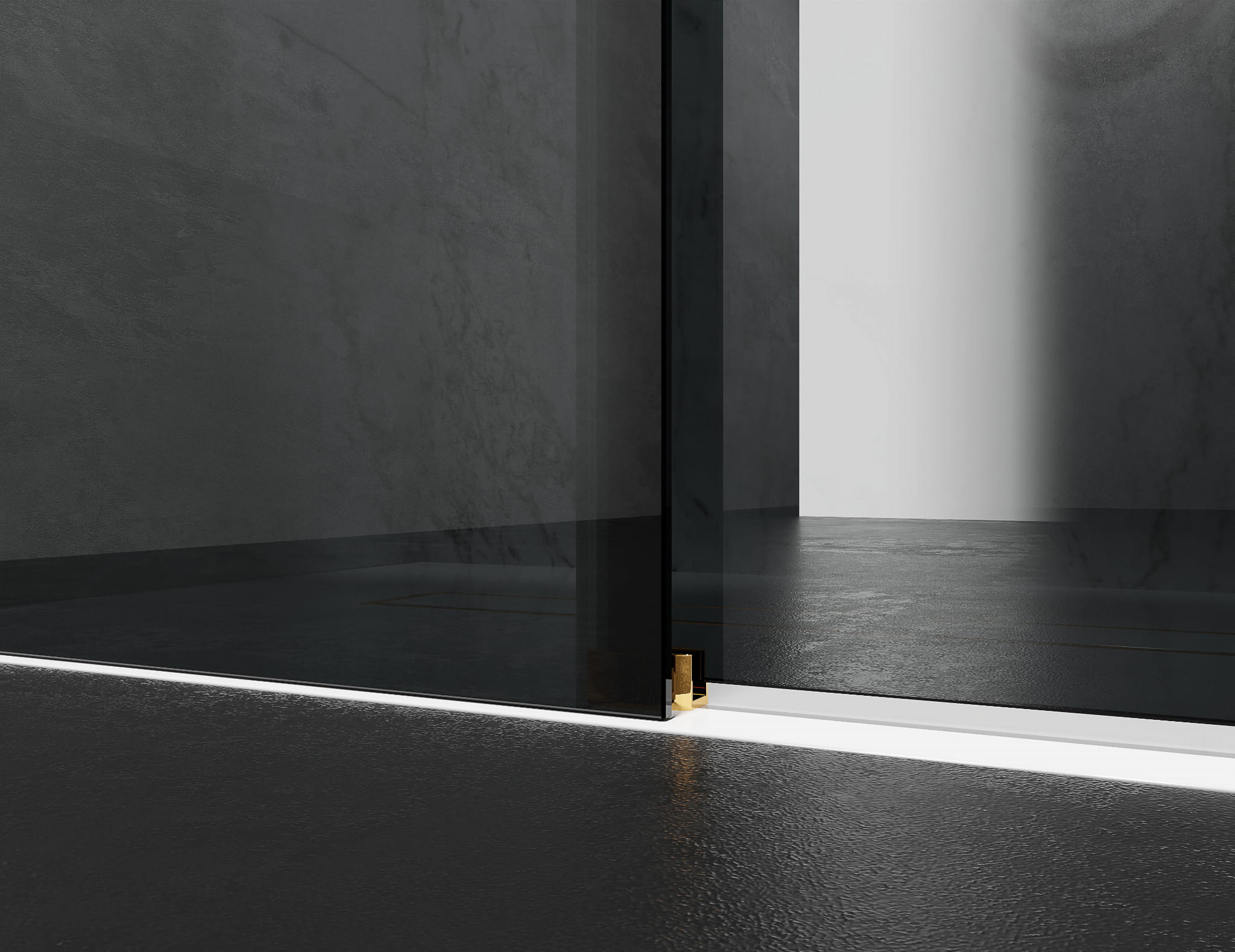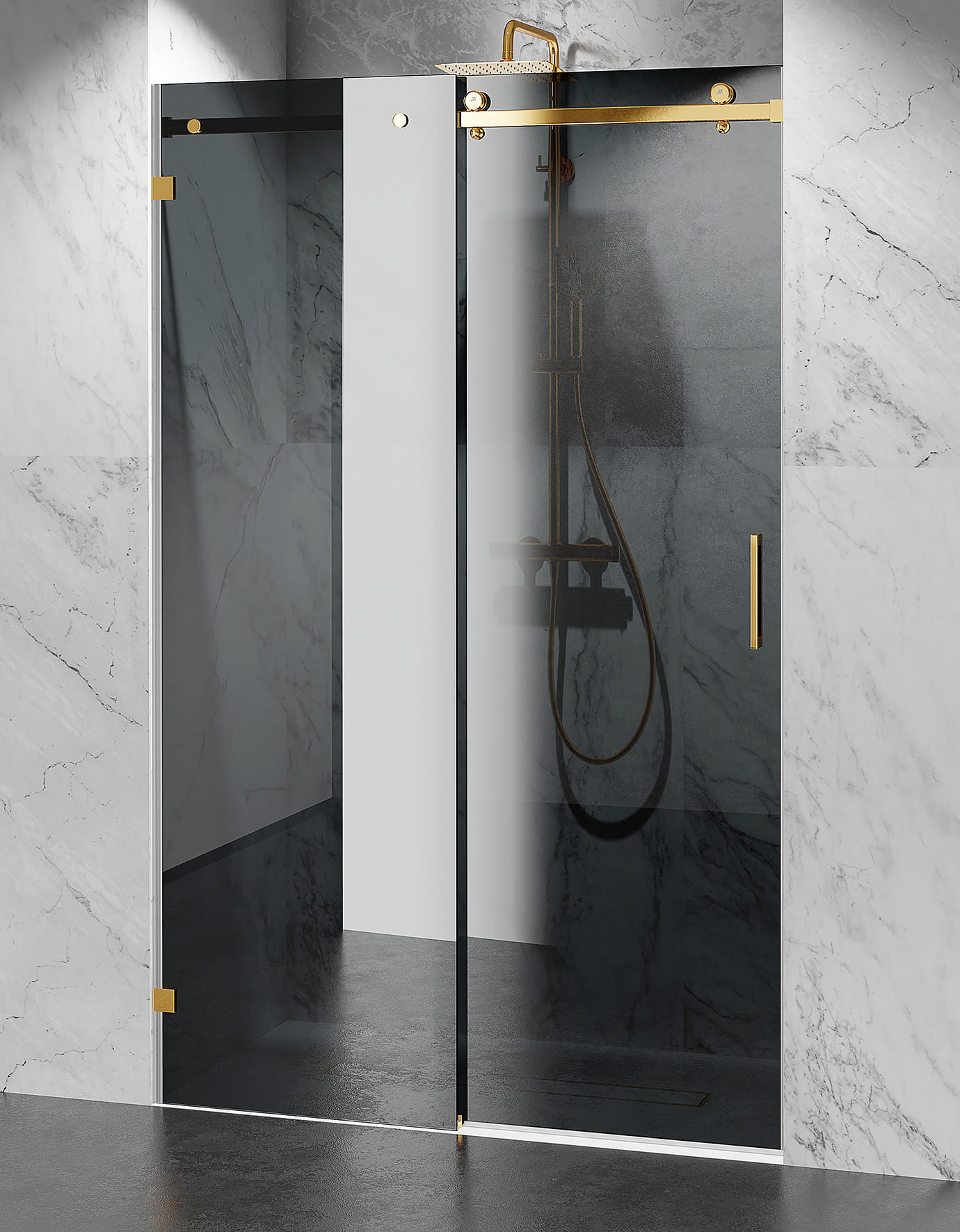 DRZWI PRYSZNICOWE PRZESUWNE BEZPROFILOWE, OKUCIA ZŁOTY POŁYSK, SZKŁO GRAFITOWE