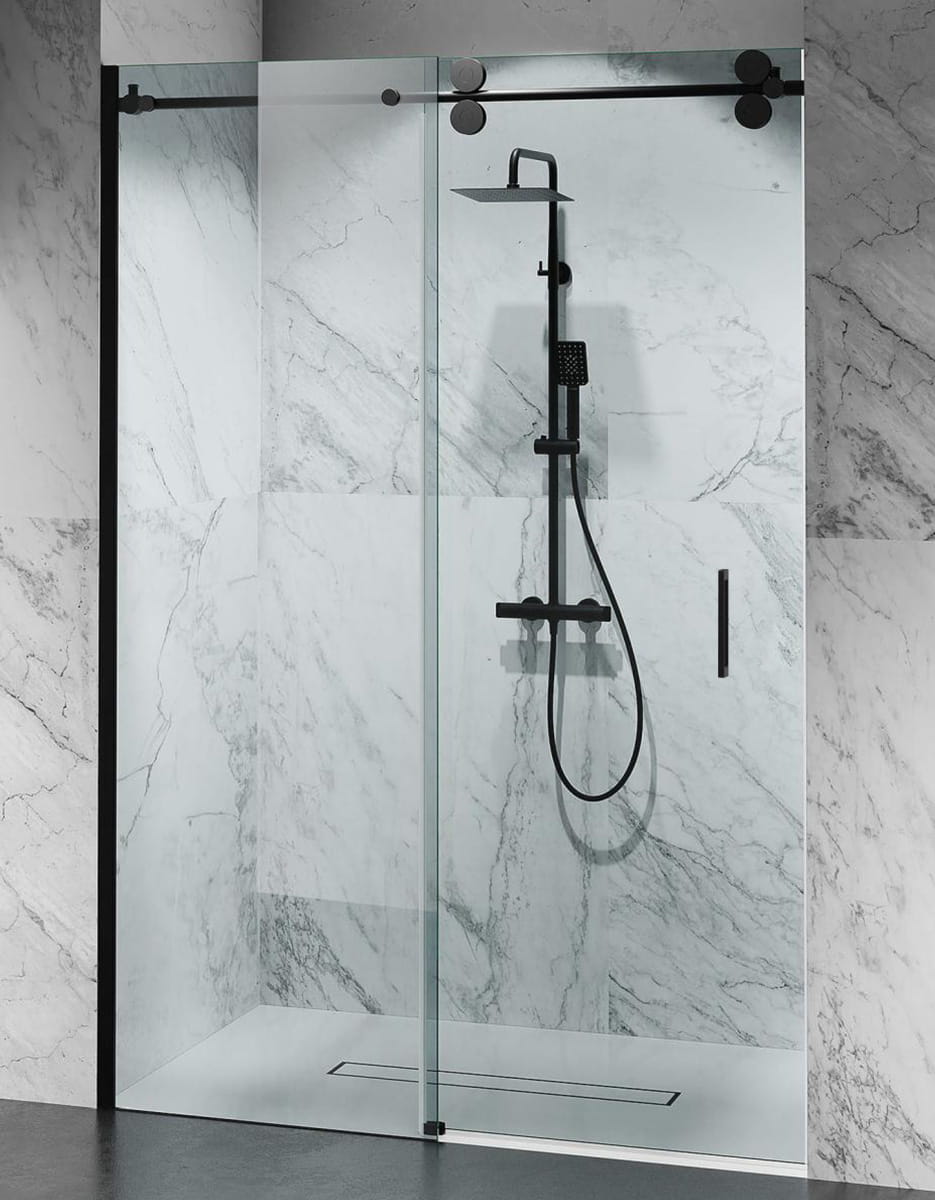 DRZWI PRYSZNICOWE PRZESUWNE, OKUCIA CZARNY MAT, SZKŁO TRANSPARENTNE,