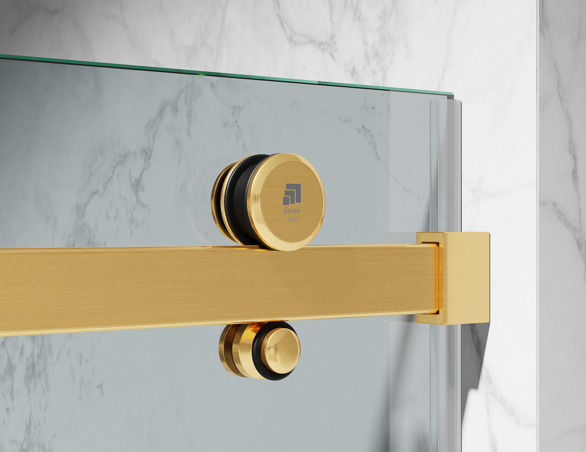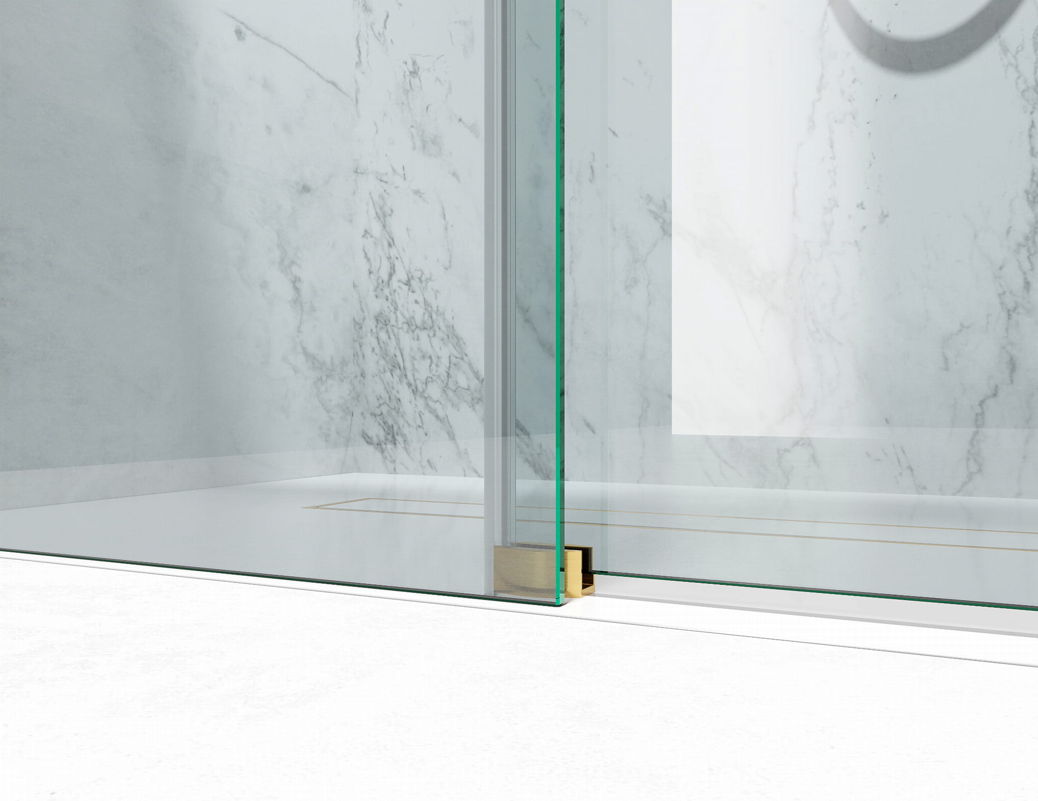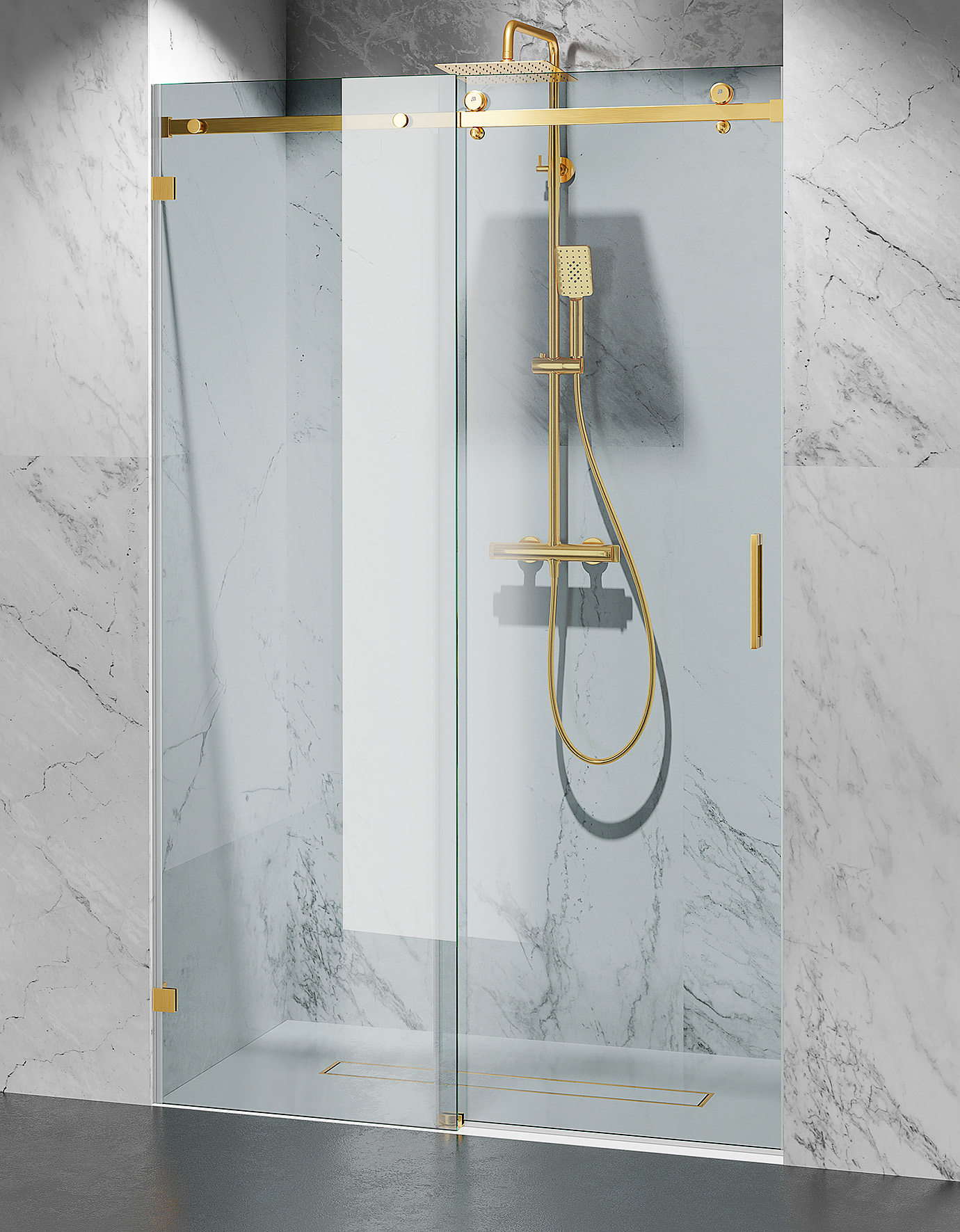 DRZWI PRYSZNICOWE PRZESUWNE BEZPROFILOWE, OKUCIA ZŁOTY MAT, SZKŁO TRANSPARENTNE