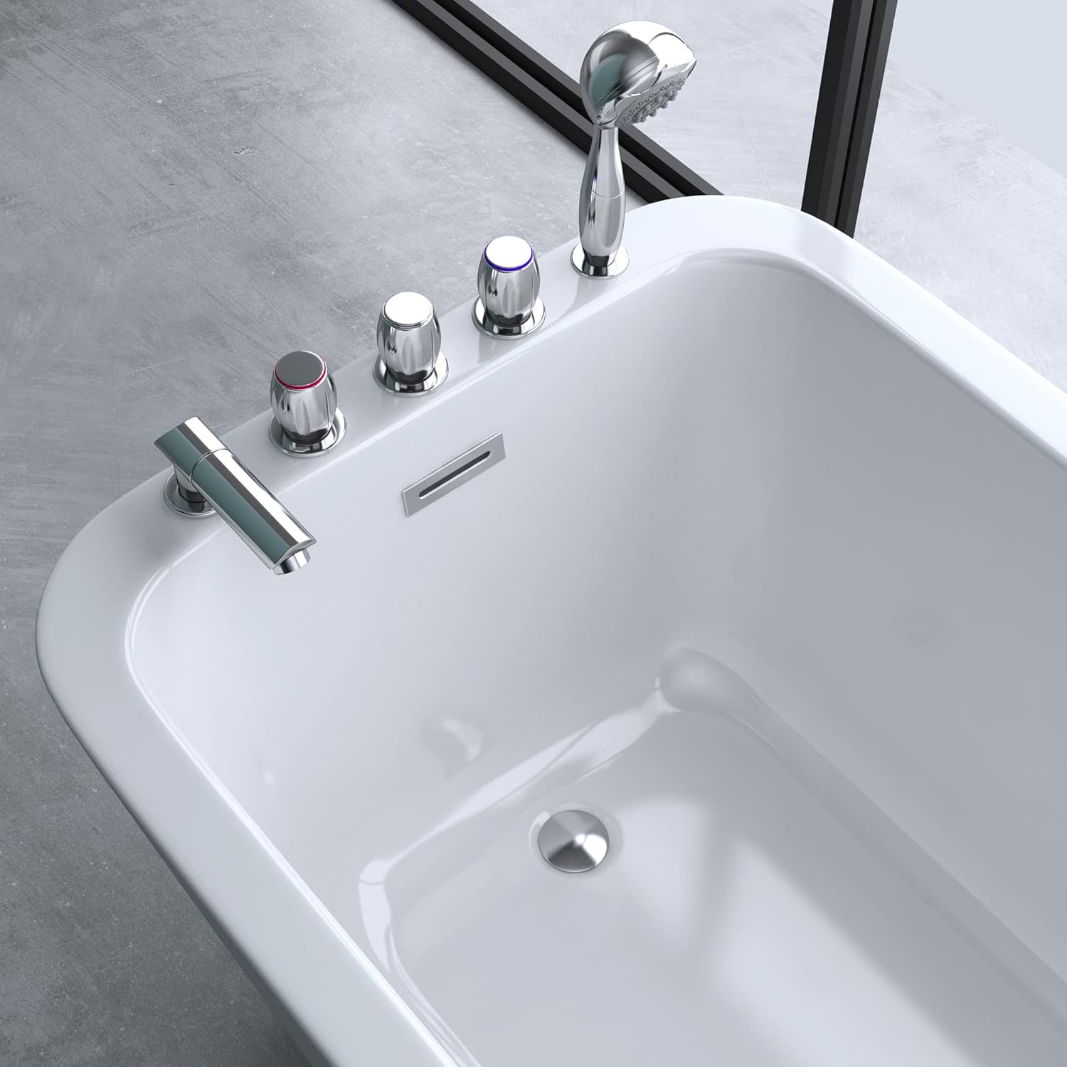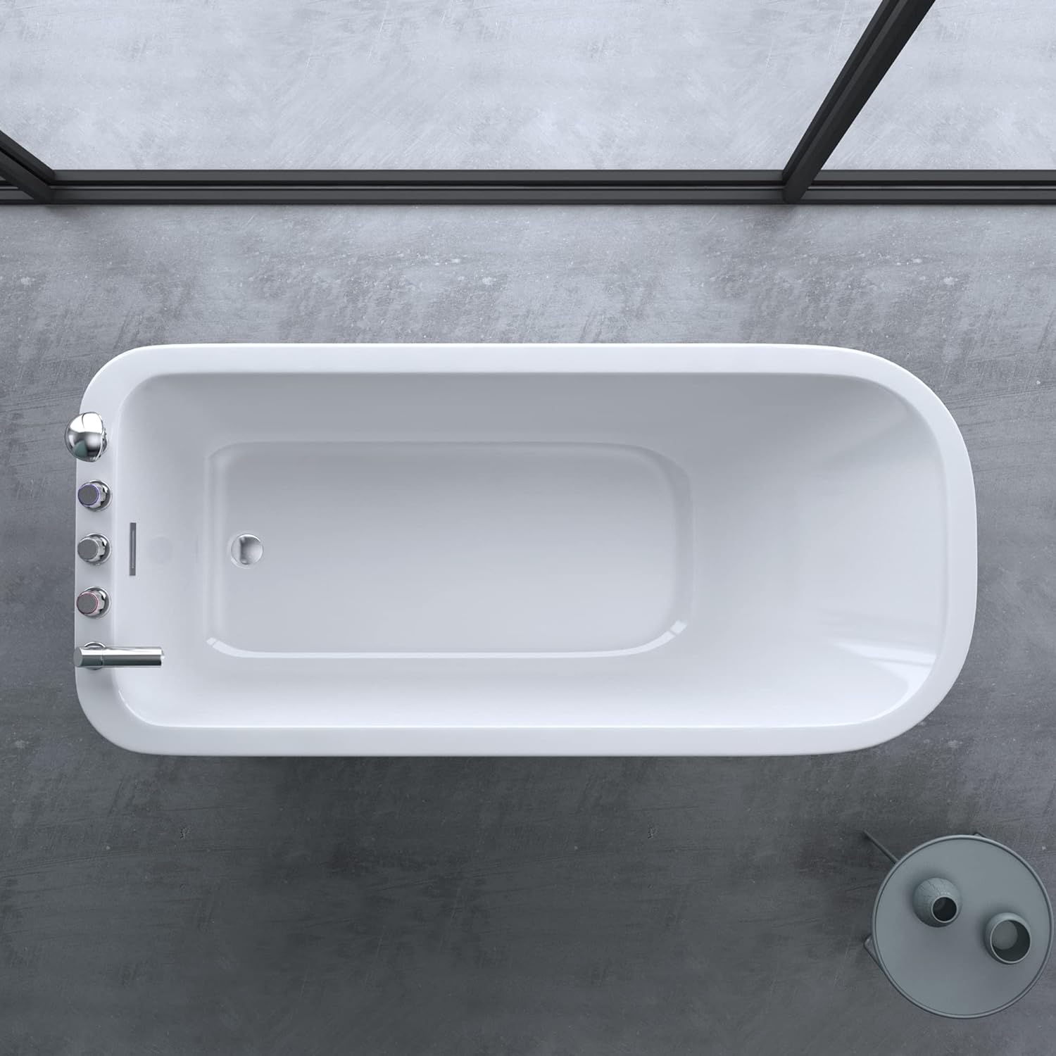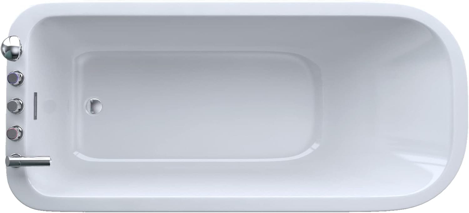 Wanna akrylowa przyścienna z jedną ścianką nie zabudowaną.z baterią 5-cio otworową i przelewem. Od spodu wanny stalowy stelaż z regulowanymi nóżkami. Wanna jest gotowa i kompletna do montażu.