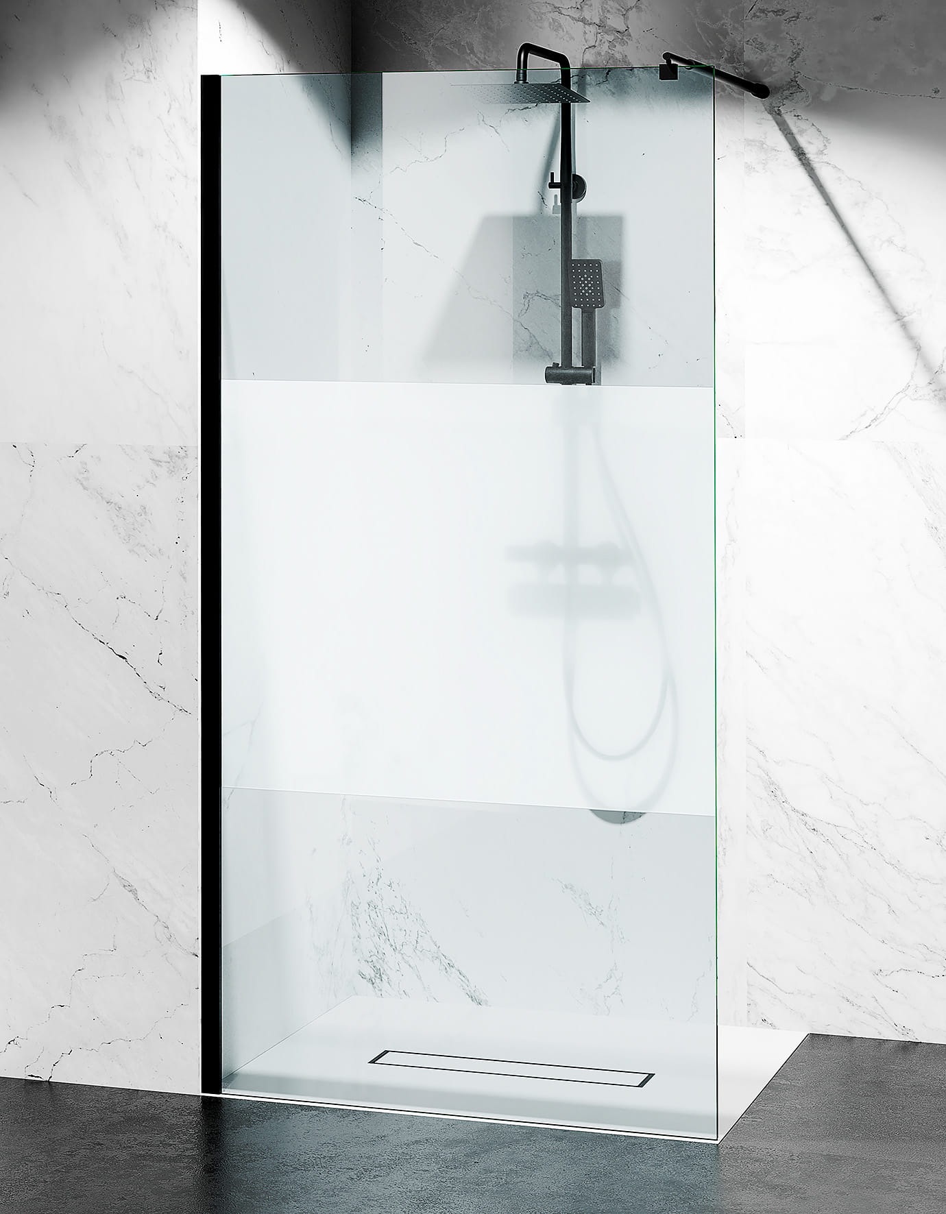 Szyba prysznicowa Walk-In, szkło Pas Mrożenia, kolor okuć: czarny mat